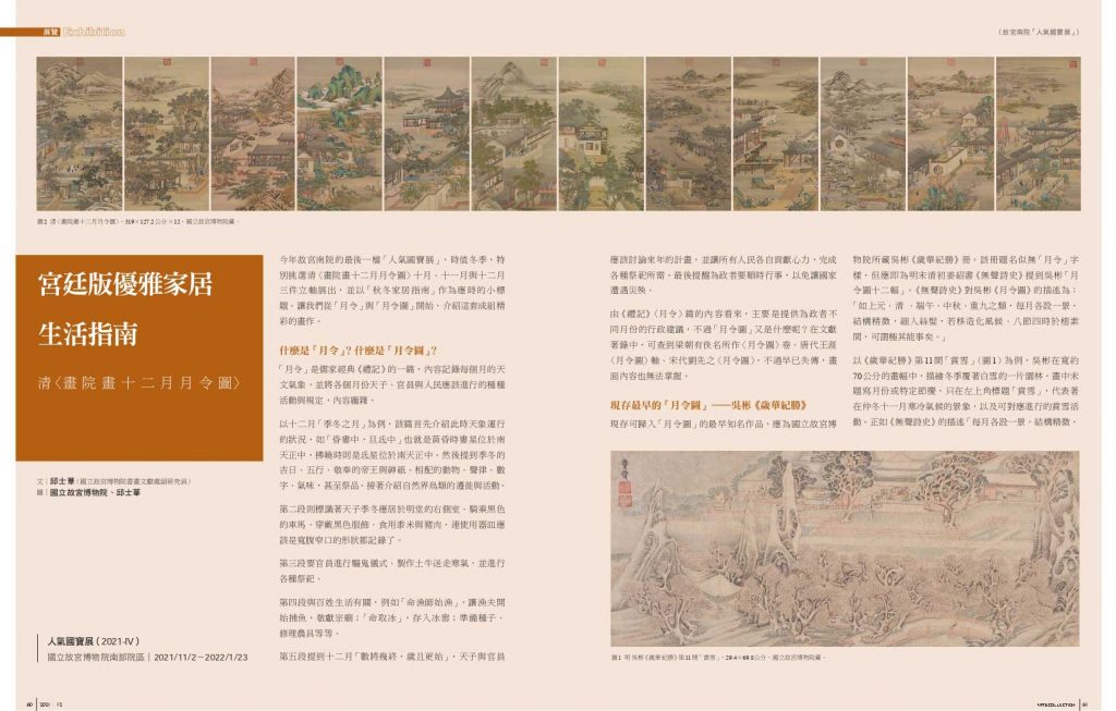 欲知清《畫院畫十二月月令圖》與《雍正十二月行樂圖》、焦秉貞《山水冊》的關聯,以及更多關於月令圖的知識,請參閱完整全文:《典藏.古美術》2021年12月號,〈宮廷版優雅家居生活指南─清《畫院畫十二月月令圖》〉,作者:邱士華(國立故宮博物院書畫文獻處副研究員)。