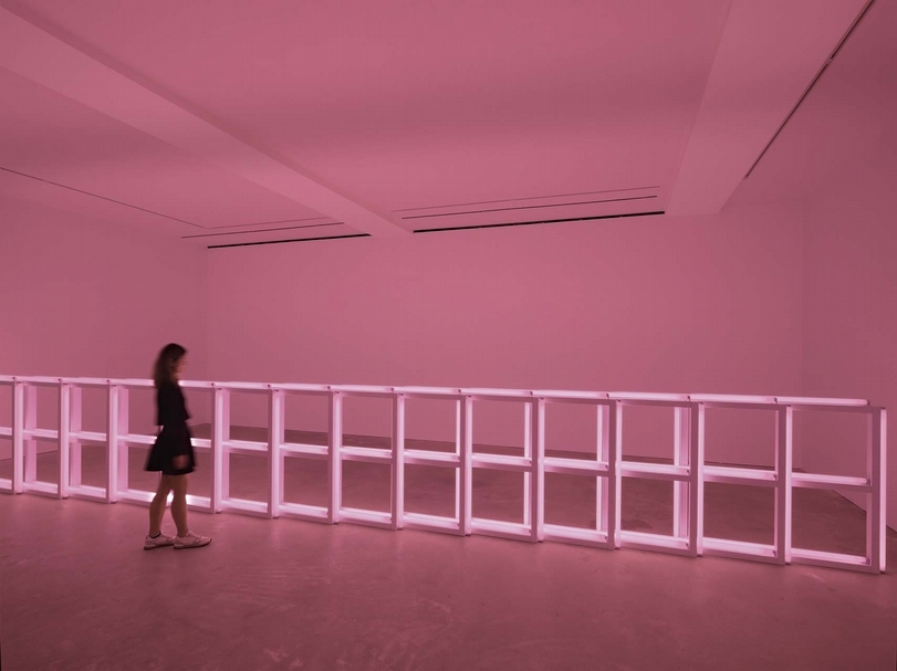 麥克拉肯和賈德關係相當友好,可能大家同是由繪畫轉型至雕塑。麥克拉肯標誌性的膠合板就這樣斜倚著牆,看似隨意之感油然而生。許他是來自加州,驟眼看像極了一塊塊正在曬乾的滑水板。唯他在板面上作亮身處理,單一顏色的表面光滑無瑕。厚實的體積好比一股神秘的力量默默地釋放,尤其是在獨立小房間內展出1974年創作的亮黑色金字塔《無題》,其不可告人的吸引力驅使觀眾踏前一探究竟。他對作品胸有成竹,絕不需要多餘的墊座來告訴大家這是件藝術品。他深信就算長方體的形狀是多麼的普遍,又採取這麼含蓄矜持的還原狀態,其奧秘也會推倒界限和規管著什麼才是藝術的天花。最後和賈德關係更為親密的弗萊文,賈德便是以他的名字來為其兒子命名。弗萊文致力用最基本的光管,在規模及顏色的調控下呈現極簡藝術的本質。現場展出1974年創作的《無題》,一組長達19米的兩層螢光燈橫斜在大展廳內,粉紅色的光管搶眼亮麗。在地板上更有倒影映照出來,迷幻模糊,整個空間都是令人不能直視的螢光粉紅。迪阿梅里奥打趣說「有說弗萊文在睡房內放著自家作品,真不知道他是如何入睡。說句實話,當初極簡藝術在1960年代展出之時,策展的方向及佈置其實都是由藝術家們一手主導。他們支配著該如何擺放,這無疑證實了空出來的間隔,也是藝術品當中的一員。從用料到展示一切看似簡單,但正是這最純粹的手法,使作品超越了時空為後世留下如此精彩、又具爭議的裝置藝術。」