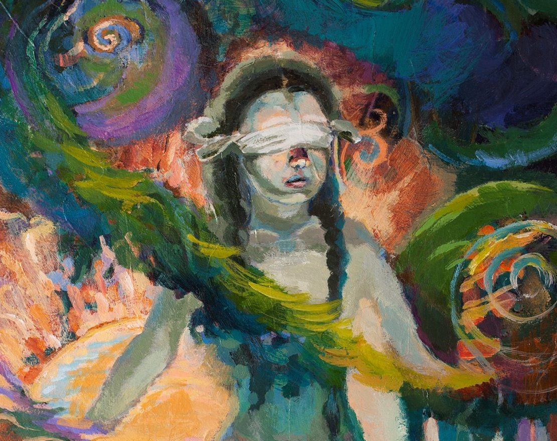 值得注意的是,此處所說「無以納入正史」,不僅是女性在政治社會層次上的不被納入。即便在藝術史的脈絡裡,郭俞平畫作裡「女兒」的形象,當然也早已遠離了寓言畫(allegory)、擺態模特兒一類被固化的女體,而是經由支離曖昧的身體特徵、內外無分的扭曲空間,以及種種突兀的用色、散落在畫面裡無法辨識的物件與符號,讓這些幾乎與神話擦邊的場景扭向無法被神話結構所化約的經驗。「Daughters」在這種含混未明的表達之中,成為未必能被納入性別運動歷程的認同分類,也脫離了既定的性別指稱。