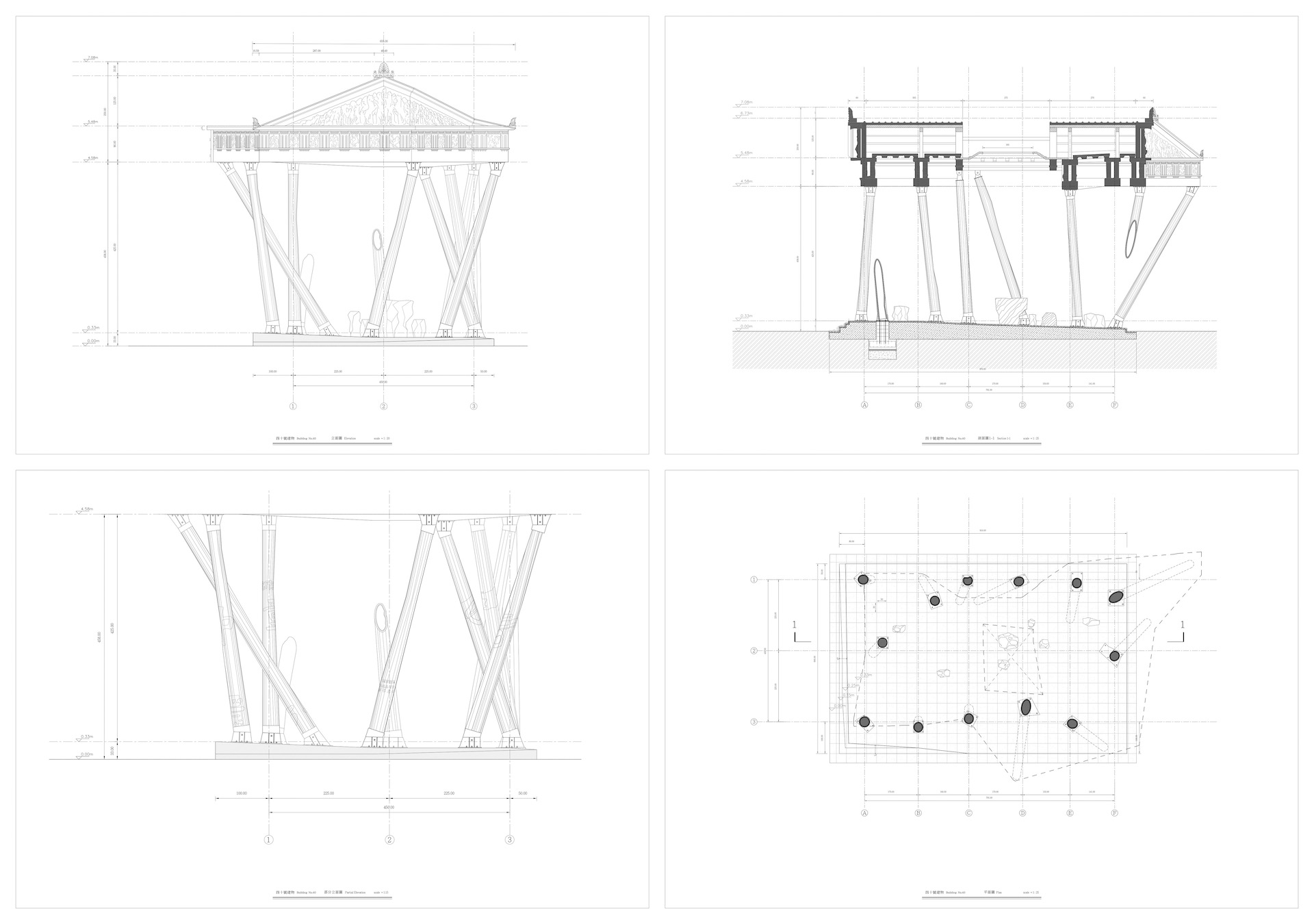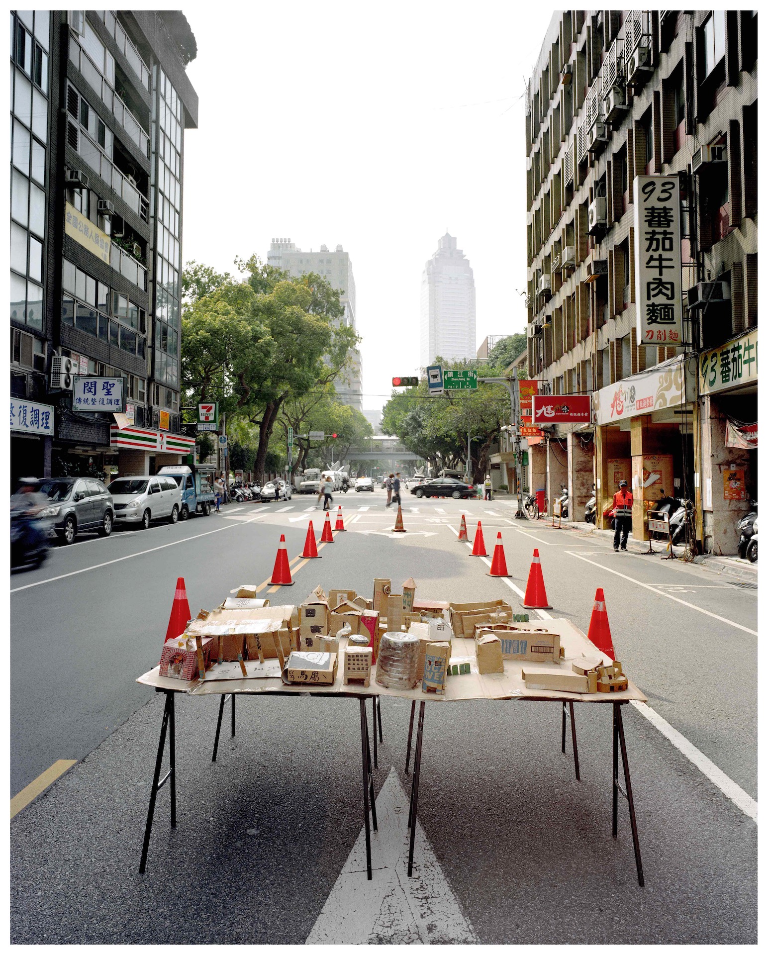 2020年在「打開—當代」的個展「紙建築」裡首先包含了一組行動藝術的攝影紀錄:這是兩人在前一年、318五週年時重返青島東路,將當年同學們合力製作的立法院周遭空間模型(作為彼時「兵棋推演」的全景沙盤)正式丟棄的一次藝術行動、一場告別的儀式。然而,在此一由相機所記錄完成的行動或儀式的「遺照」對面的展牆上,則是四張一組的「藍圖」(它們同時也構成了此次展覽的海報):以希臘雅典的「帕德嫩神廟」為摹本的建築藍圖。