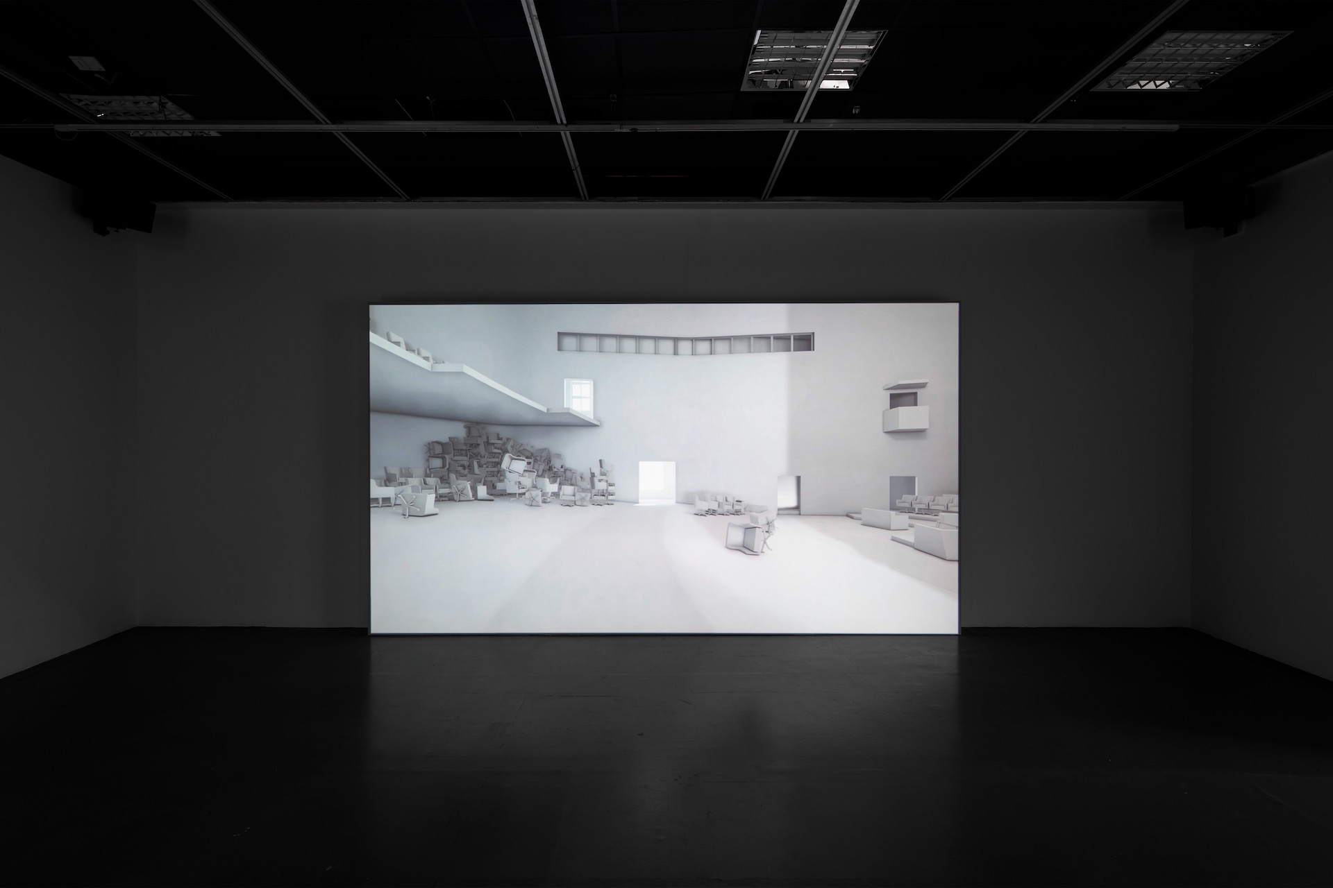在這部錄像作品裡,銀幕上的建築由電腦繪圖而成,純白、平滑、無機、低限極簡,近似「石膏翻模」的「白盒子」,其建物影像質地,除了「石膏(像/模)」在藝術場域難以避免指涉的美術習作、對於形式基礎的習作,在習作的同時形塑、因而介於臨摹與創造、介於既定固有性與變異可能性、乃至於潛勢在開放與封閉之間(此處借助了南西關於「素描」的論述),(註15)而且,在視覺層面上,「白」本身也總是已經悖論式地同時指涉了透明與不透明、可見與不可見。而這讓此一「白盒子」再次宿命性地鉤沉了再現論題。