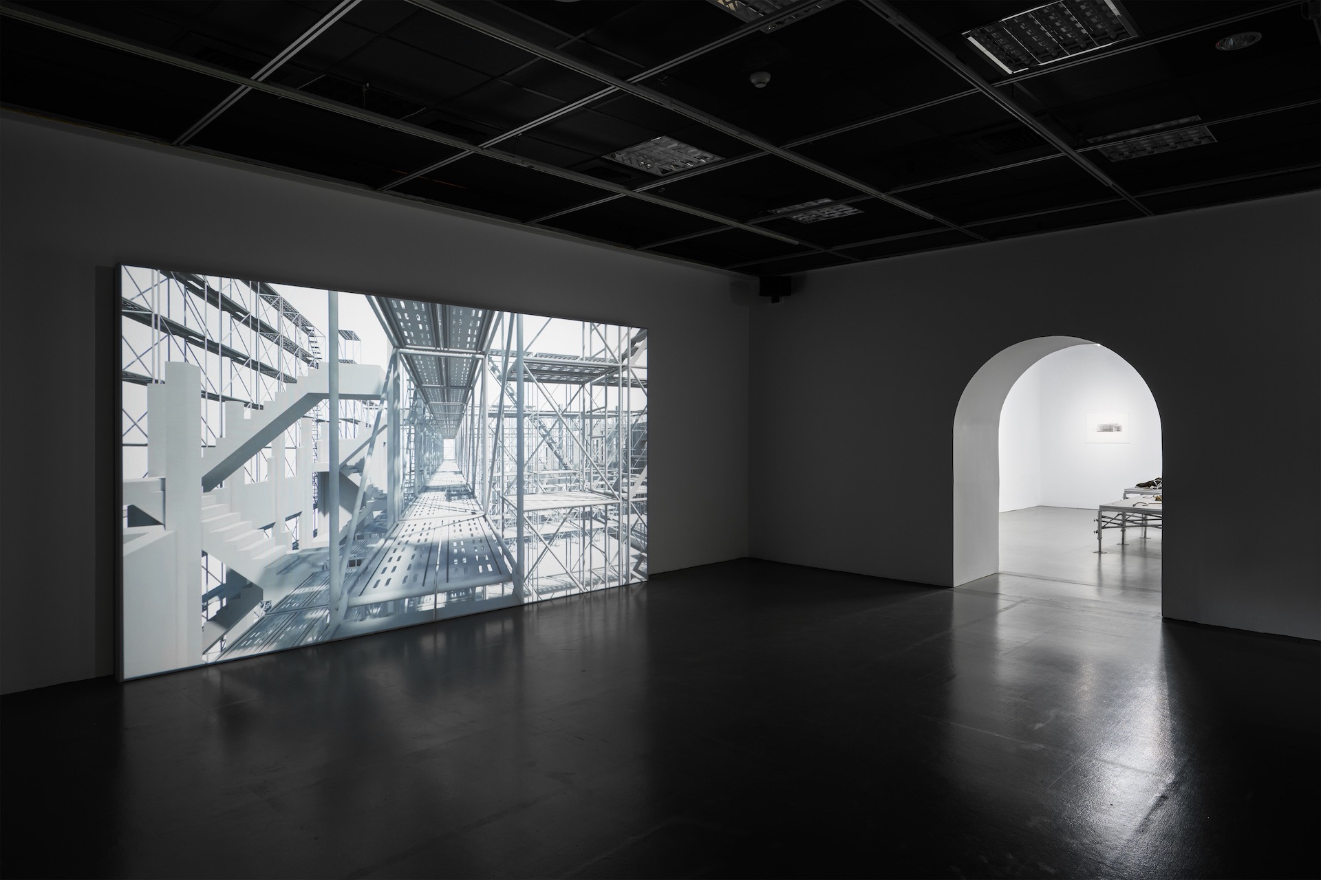 延續二人的「空間/建築」小母題,前述藍圖的內在悖論,這次在錄像裡立法院外牆的「鷹架」上體現與啟動。兩人選擇拍攝「施工中的立法院」別有用心:施工中的鷹架既是也不是建築的一部份。建築的成立需要鷹架,但在建築成立那一瞬,鷹架就立刻變得無用了、被拆卸了。因此,鷹架「既內且外」,甚至,攝影機不只拍攝建築體的結構,也認真沿著鷹架的架接延伸路徑而一路進行巡視與檢視(幾乎像是工人或工頭在檢查施工品質),彷彿鷹架和建築體同樣值得凝看、同屬一片風景/地景、對於再現議場同等重要。而且,鷹架並不僅只搭設於外牆,還伸進、插入建物內部的空間裡,似乎有意化身「輕鋼架」來充當或取代支撐建築體的「桁樑」;當攝影機來到建物之外、轉頭回望,建物正面外牆的鷹架居然兀自遮蔽了,進而取代了建物的「立面」或「門面」。鷹架對於建物的「既內且外」(此時已然逼近德希達對於「畫作」與「畫框」之間關係的論述),(註10)就不只是工事輔具,反而另有了政治的隱喻:在2019年的行動裡扔棄了立法院模型之後,卻又在《複本》裡重返立法院、重建立法院的「複本」,然而,鷹架一邊協力建築工事、一邊戮力取而代之,因而可以說是矛盾地同時「建」與「拆」,在重建的同時進行拆毀。