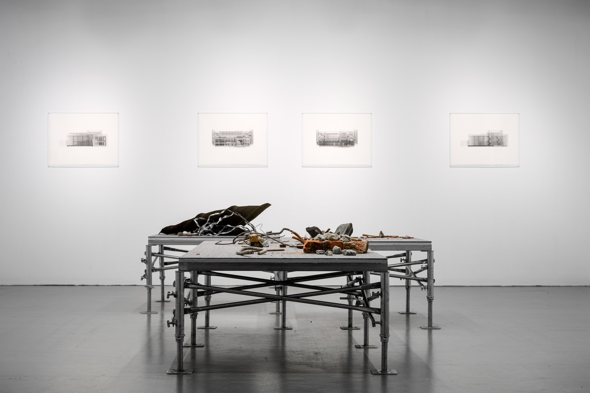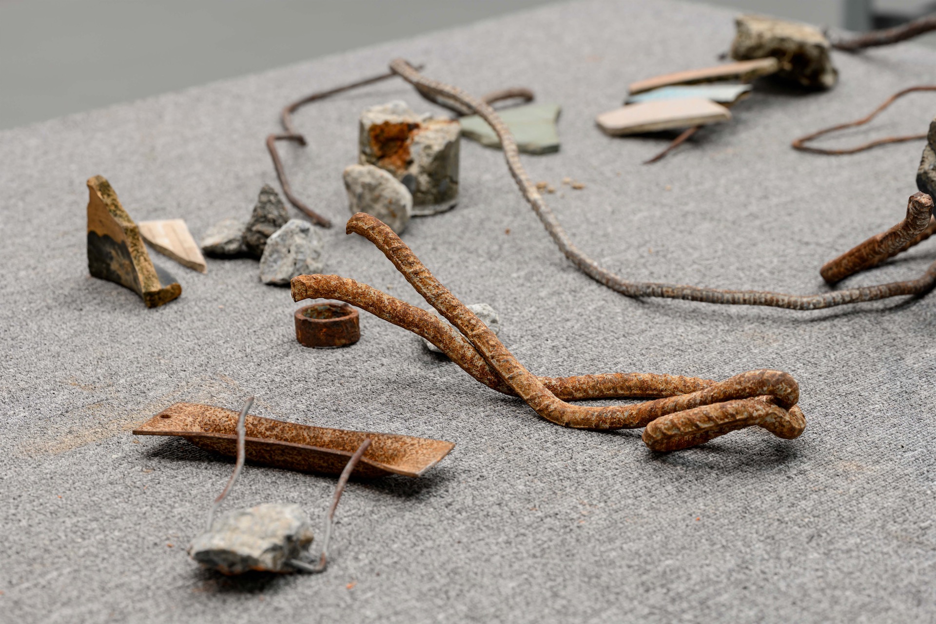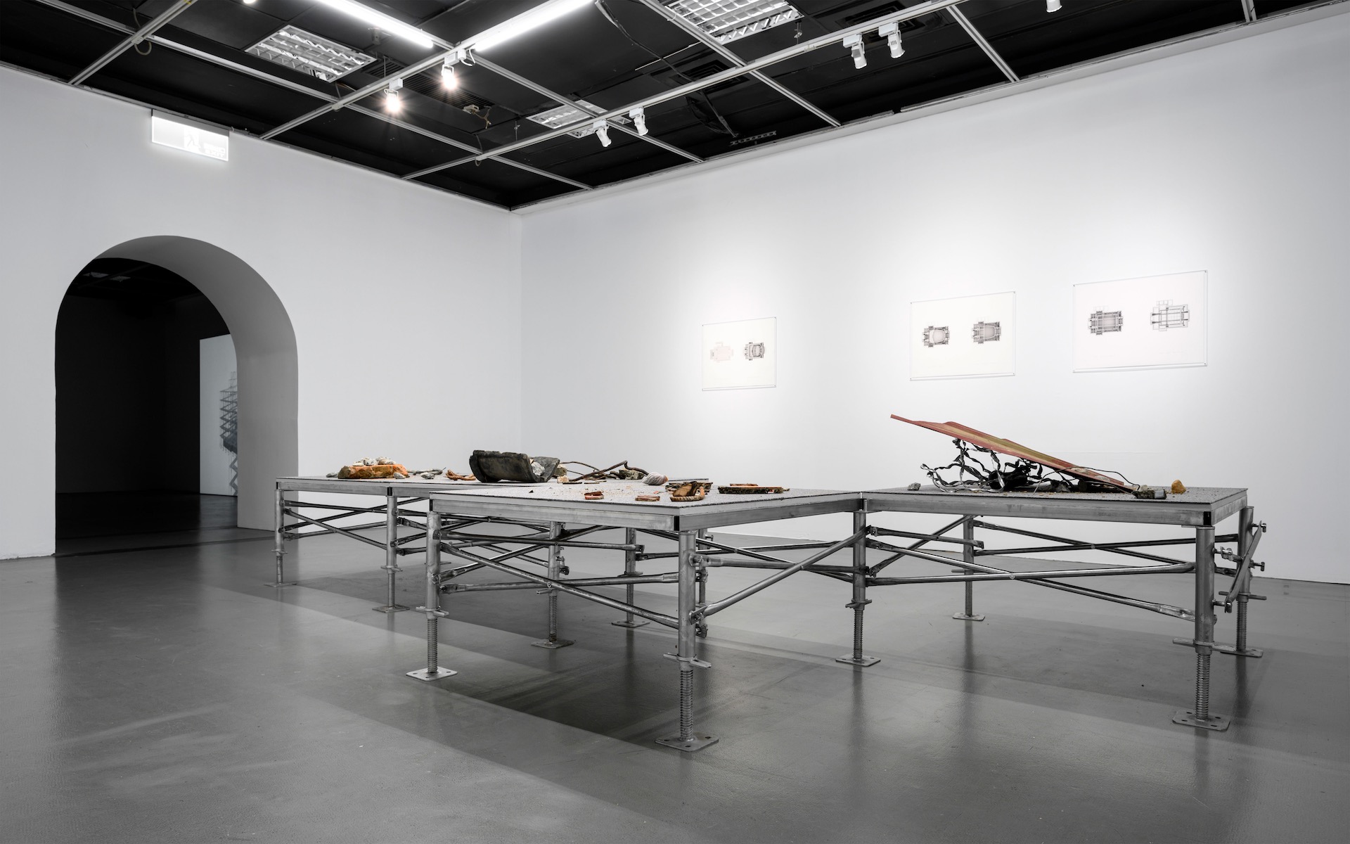 然而,一旦考慮到《複本》這件錄像的(與影像相反的、在視覺上缺席的)「聲軌」,以及另一展間裡的(與錄像裡「建築體打造」相反的)一片展檯上星佈的「斷瓦殘垣」,兩人這次展覽真正的、根柢的政治批判,方才鮮明、充實、尖銳了起來。