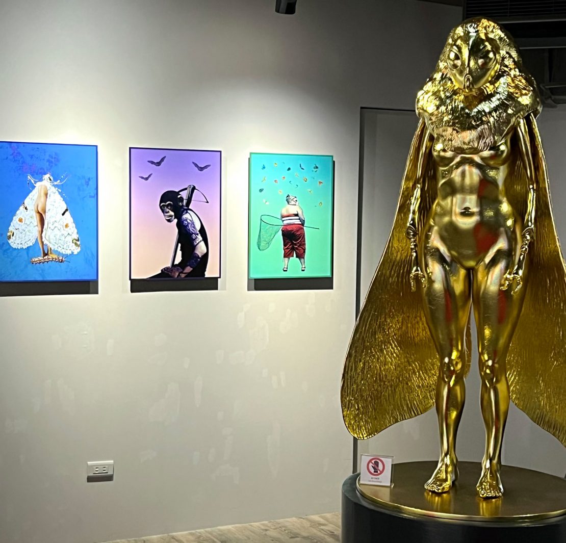 而《蜻蜓女子》裡失去口鼻的人物,無疑是對疫情時代生存狀態的映照,長期戴口罩遮掩口鼻,未來的人類是否會不再需要這兩個器官?《變奏》則是所有概念的集大成,系列作品中人與動物及昆蟲混種而生成的角色,都一一拼貼在色彩鮮豔且飽和的色塊上,扁平空間仿佛抽離了時空,隨著各種人類、動物與昆蟲形態的改變及融合,蔓延開來的奇幻氛圍,如同末日預言般,擘劃著未來世界的樣態。