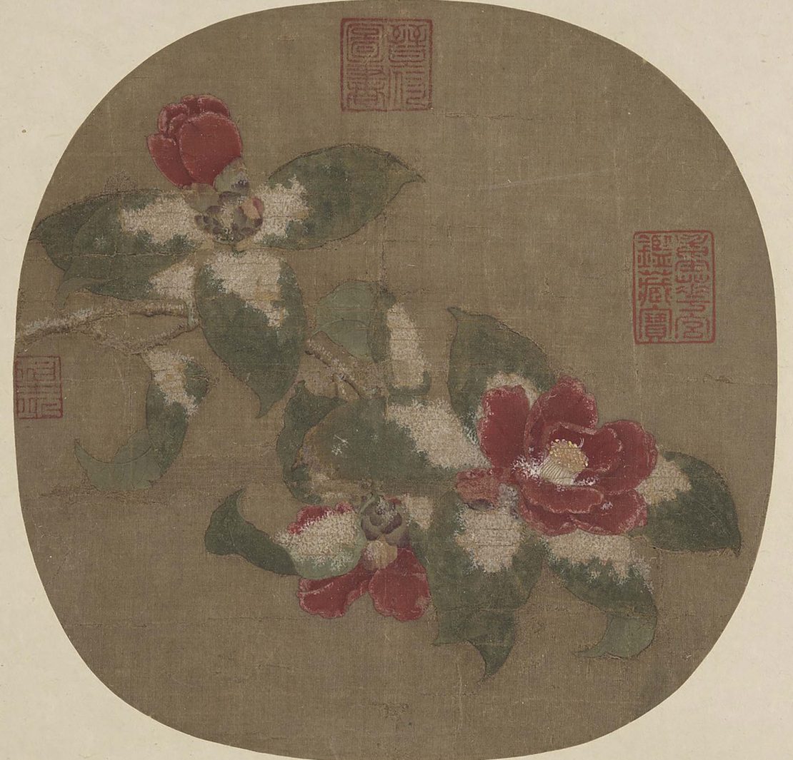 林椿是活動於孝宗朝時的宮廷畫家,工畫花鳥草蟲,意趣清雅。〈山茶霽雪〉(圖14)帶領觀者近距離地觀看山茶花,畫面上分別呈現了它們盛開、含苞以及掩映的姿態。山茶花最為顯著的特徵便是花朵中心的柱狀花蕊,鮮亮的黃色花蕊與豔紅的花瓣,形成對比強烈的視覺印象。綠葉上的白色積雪更加映襯出山茶花的顏色,同時與題名相和。另一件林椿作品〈橙黃橘綠〉(圖15),雖與前述傳趙令穰之作同名,但表現方式截然不同。林椿之作將焦點凝聚在柑橘果實上,表皮的顆粒感都被細緻地表現出來。畫家描繪花卉時,不僅是單單描繪出物象細節,更多了對於花卉生命力,以及四時美好的關注。