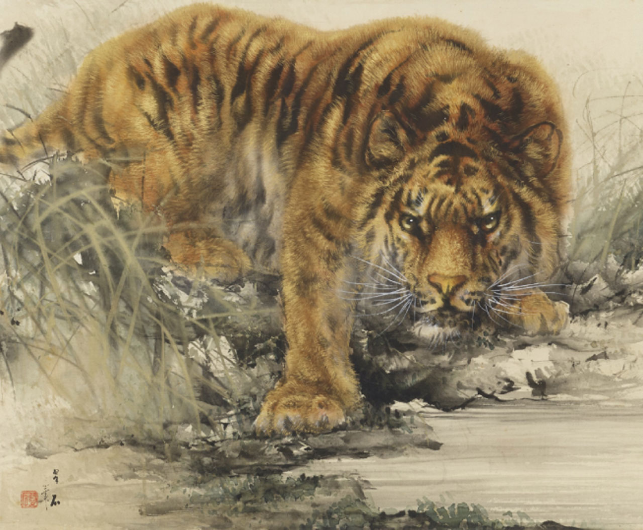 竹內栖鳳為明治時代的京都畫壇權威。《猛虎》是他在嵐山車站周邊的「霞中庵」私宅完成的作品。嘴巴半開的老虎缺少了威猛氣勢、卻聚精會神、往上飛撲獵物。另外與竹內栖鳳、橫山大觀並駕齊驅的大橋翠石,更是潛心鑽研老虎的代表畫家。同前作品的動作,《猛虎之圖》 裡的老虎緊盯前方獵物,不明顯的虎紋與草叢顏色巧妙融合,可見畫家安排的用心。
