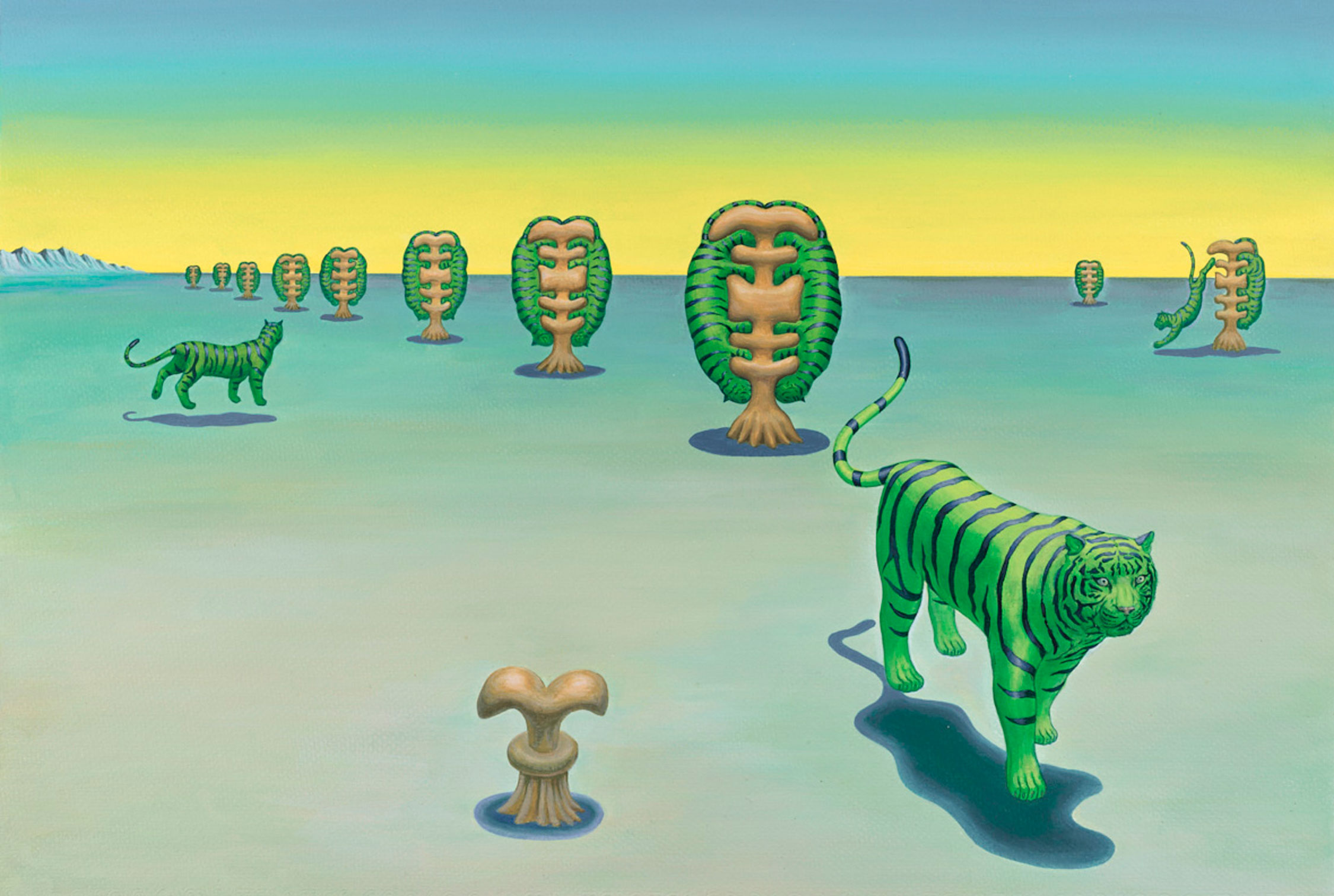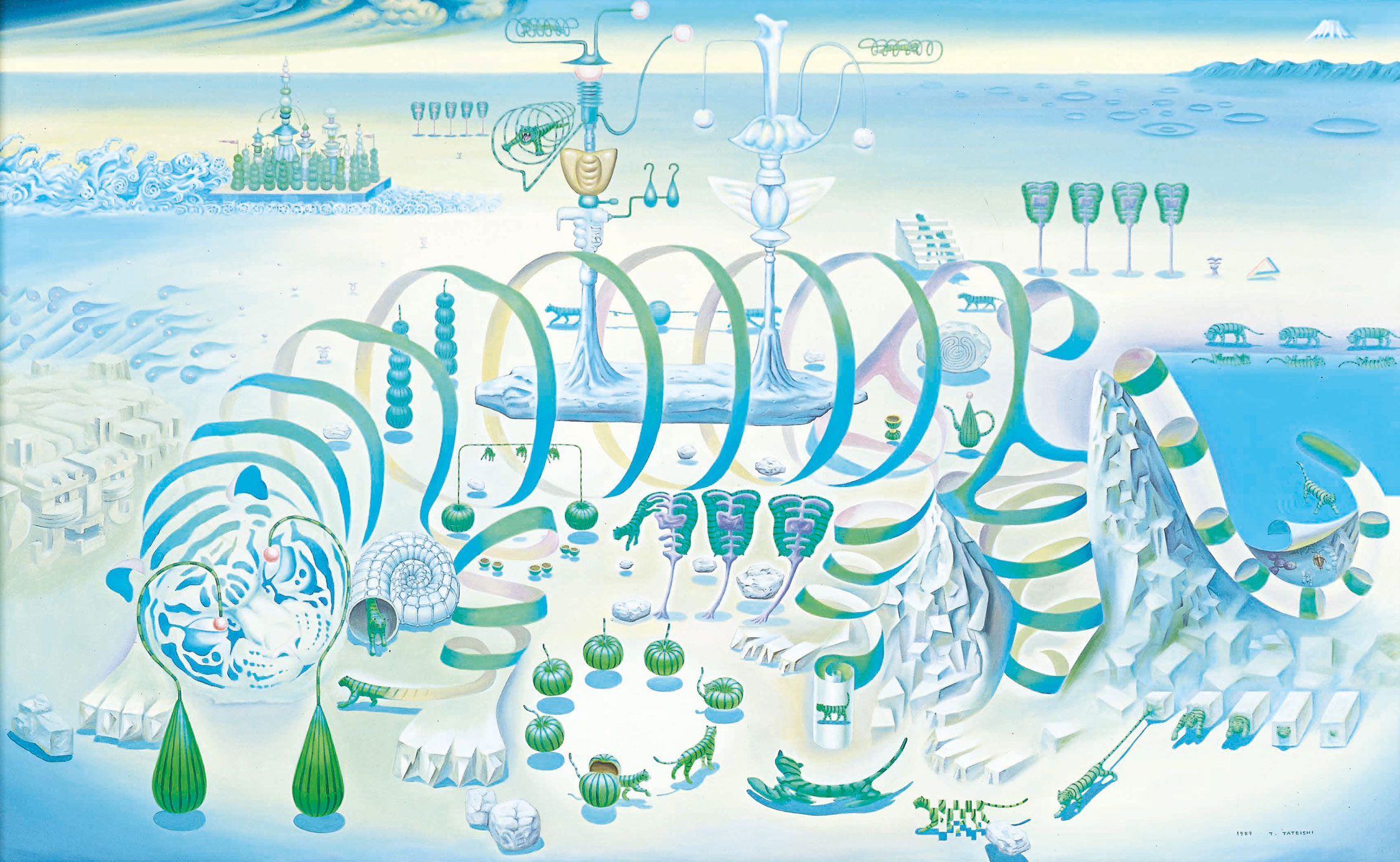 縱使立石題材多變,仍可以在不同時期的作品發現老虎的蹤跡。這與超現實主義藝術家不斷對同一主題進行描寫的傾向不謀而合,立石也在後來的訪談承認其受到超現實主義的影響,也隱含再三確認自我原創性的心情(註2)。「紙老虎」的俗諺與日語通用,立石將其字義上的虛張聲勢用於畫面,以表達想將物體再現、卻又不完全還原的矛盾概念,也是他不斷處理的創作課題。