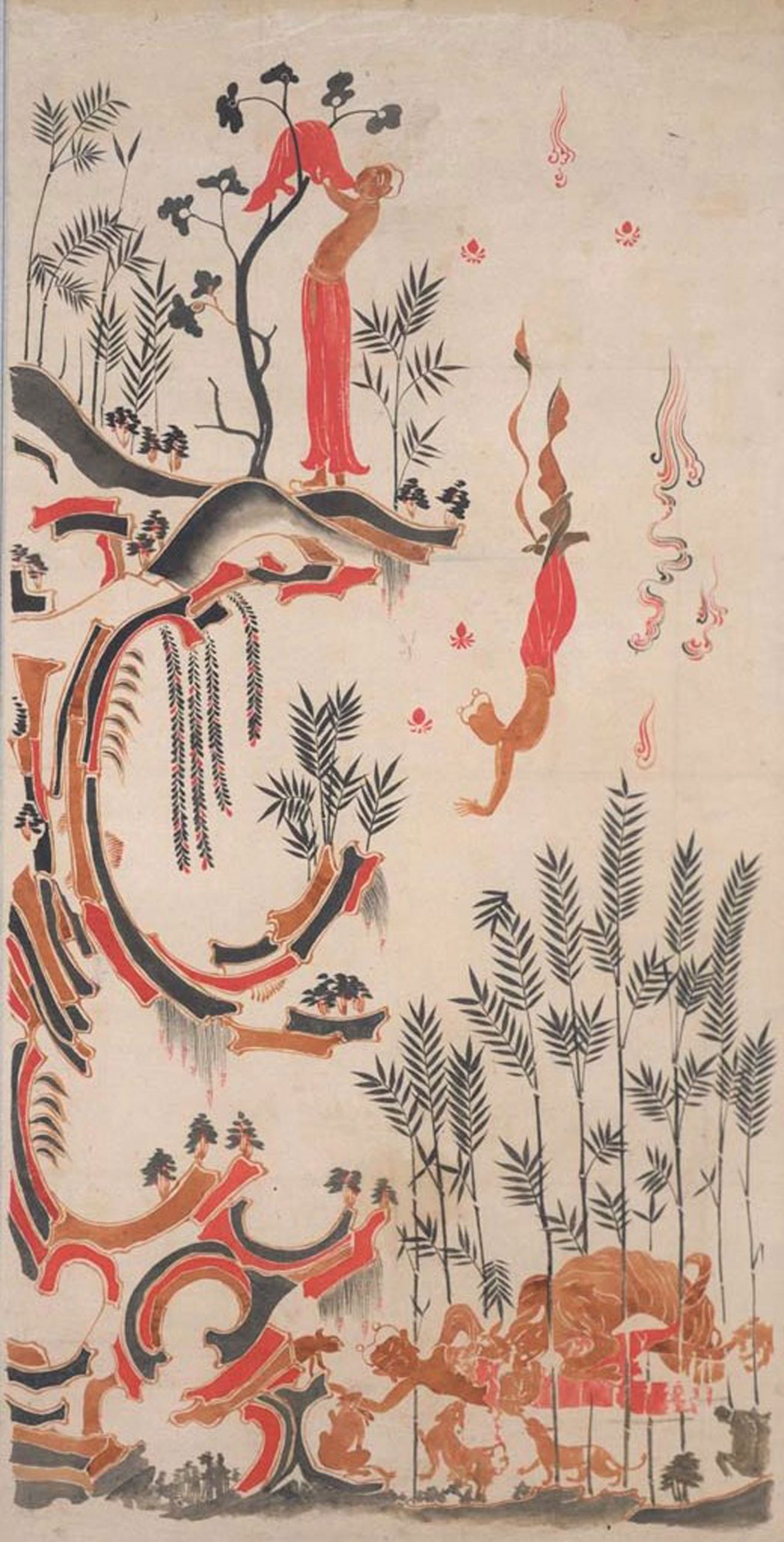 在東京國立博物館的寅年新春展中,特別用老虎迎接開館150週年的序幕。以佛教傳說、日本之虎、亞洲之虎、博物館學……等多重觀點討論其藝術性。首先透過《捨身飼虎圖》來展示老虎作為靈獸、避邪的宗教意義。畫面臨摹自法隆寺的佛教工藝品玉蟲廚子上的圖像,紀錄釋迦摩尼佛前世仍為薩埵王子時,犧牲自我、餵予飢饉老虎母子的過程。