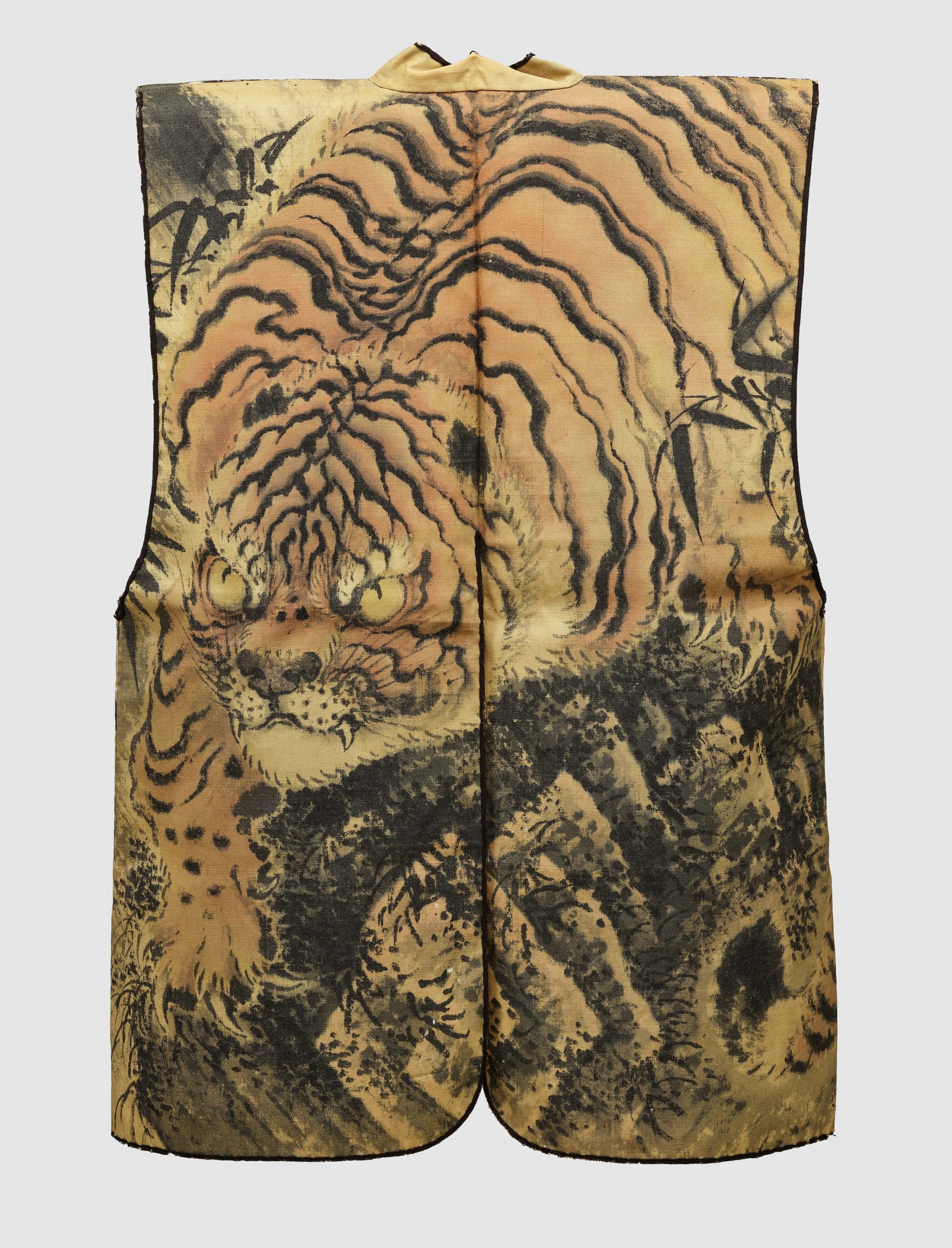 老虎的意象也被用在金工、漆器、瓷器上,比如本展主視覺——19世紀的服裝《陣羽織 白吳絽連地虎模樣描繪》。別於過往將動物繡在衣服肩頸、衣袖,這件作品直接把目光炯炯的老虎佔滿背部。縱使陣羽織為日本戰時服裝,在祥和的江戶時代仍代表武士的榮耀地位。