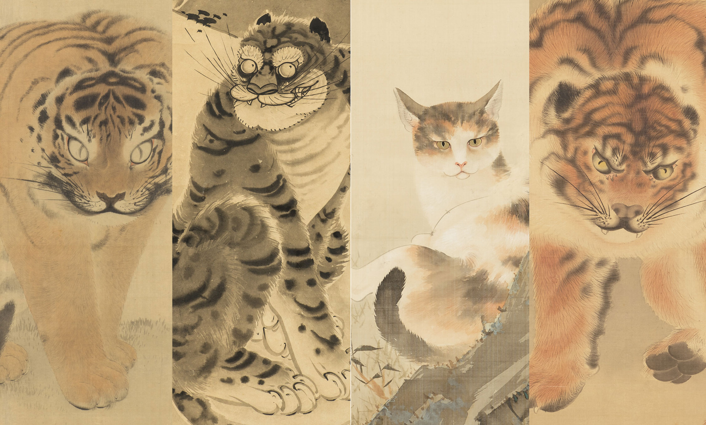 另外,位在京都嵐山、由民間經營的福田美術館,從1500件館藏中篩選動物畫精華,讓參觀者飽覽老虎與其他生肖的生動意象。當時的江戶時代畫家因無法觀察老虎,於是參考中國輸入的繪畫與毛皮,再將其應用在貓的立體構造來描繪。這造成了當時的日本虎像前腳無關節、仰頭過度、肩部過高……等,近似貓而不自然的傾向。如圓山應舉的《虎圖》(下圖左一)以及長澤芦洲的《虎圖》(下圖右一)裡,老虎的兩隻前腳或交錯或並排,即是參考貓走動與靜坐的模樣。與其說威風凜凜,貓系可愛的形容或許更為貼切。