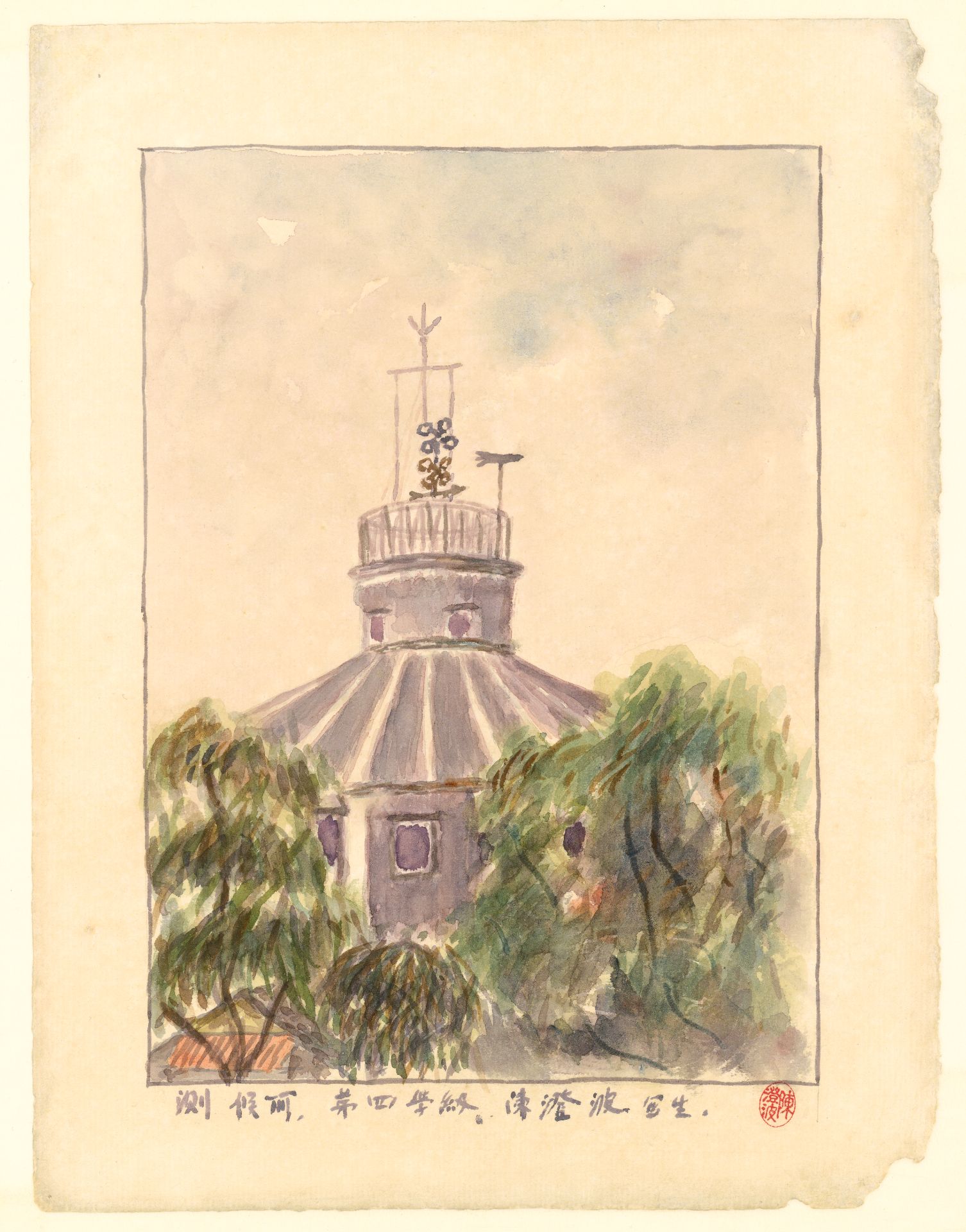 陳澄波出生於割台的1895年,父親陳守愚有秀才功名。然陳澄波因出世不久即遭母喪,父親又因執教東席,長年在外,所以是由祖母林寶珠所帶大,與祖母之間的感情深厚。1913年,陳澄波考入台北國語學校,並於此時接受石川欽一郎的指導。本次展覽展出目前可見最早的一張陳澄波水彩作品《測候所》繪於1914年,即是在陳澄波於台北就讀期間的創作,設色淡雅的水彩寫生,所描繪的應該是在國語學校附近的台北測候所(今中央氣象局),雖然筆觸頗為生澀,但多少可見到石川欽一郎的風格影響。