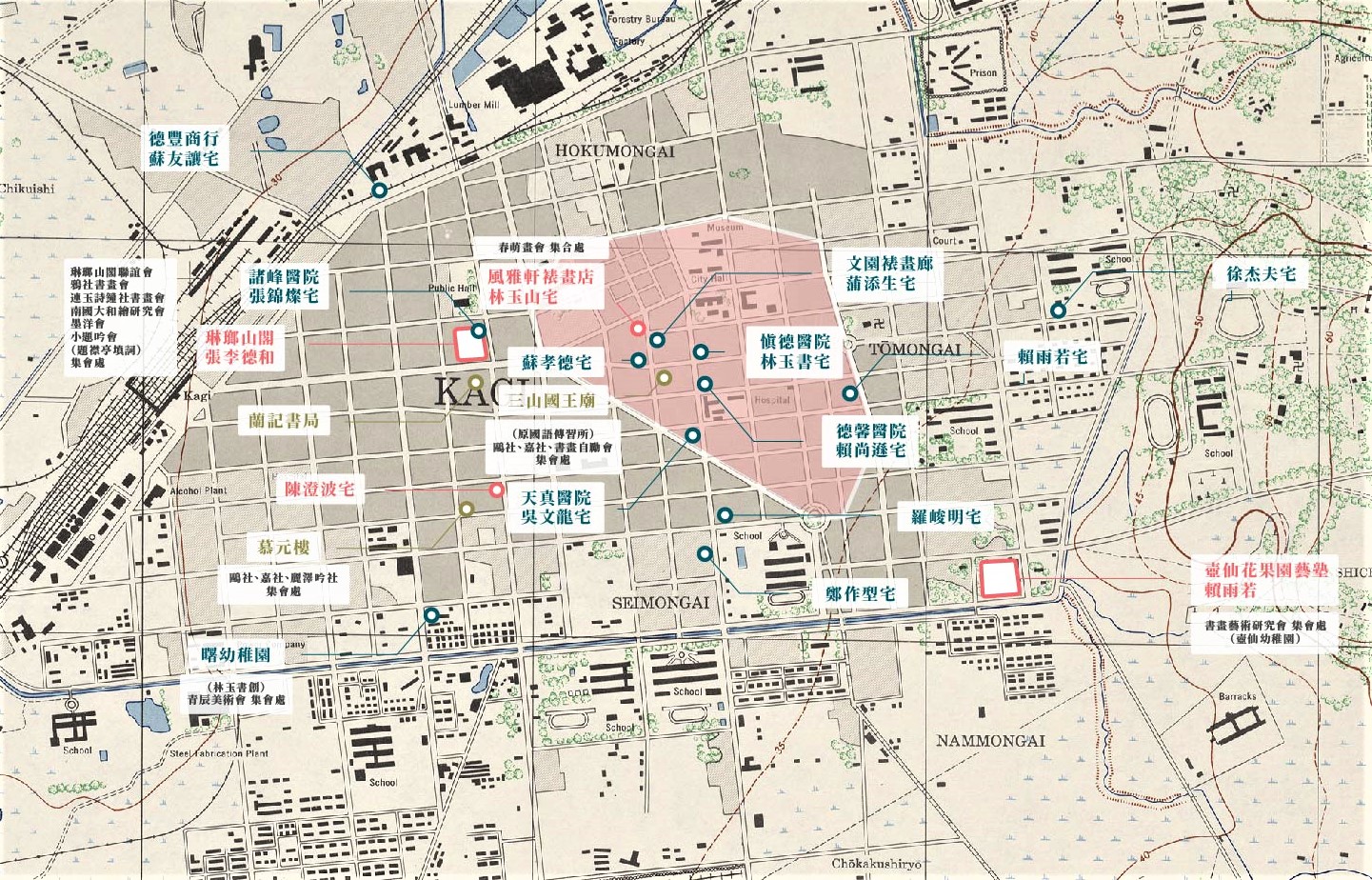嘉美館「人.間─陳澄波與畫都」展以陳澄波為出發點,開展出三個子題,包含「以文會友」、「現代生活的觀察」與「筆畫與形體」。在「以文會友」中,可以看到陳澄波與嘉義仕紳的往來互動,展出張李德和、林玉山、莊伯容、蘇友讓、蘇孝德等多位仕紳與畫家的作品文獻,當中有不少聚會期間所合作的書畫作品。比如展覽中展出林玉書贈與陳澄波的《畫中八仙歌》條幅,映射當時畫家與仕紳之間的互動關係,具有珍貴的史料價值。此外,二樓展出嘉義舊地圖,標出當時嘉義畫家與仕紳的住所與聚會地點,可藉此了解當時具體的地理空間,進一步想像當年他們在雅集當中互為唱和的風雅蘊藉。
