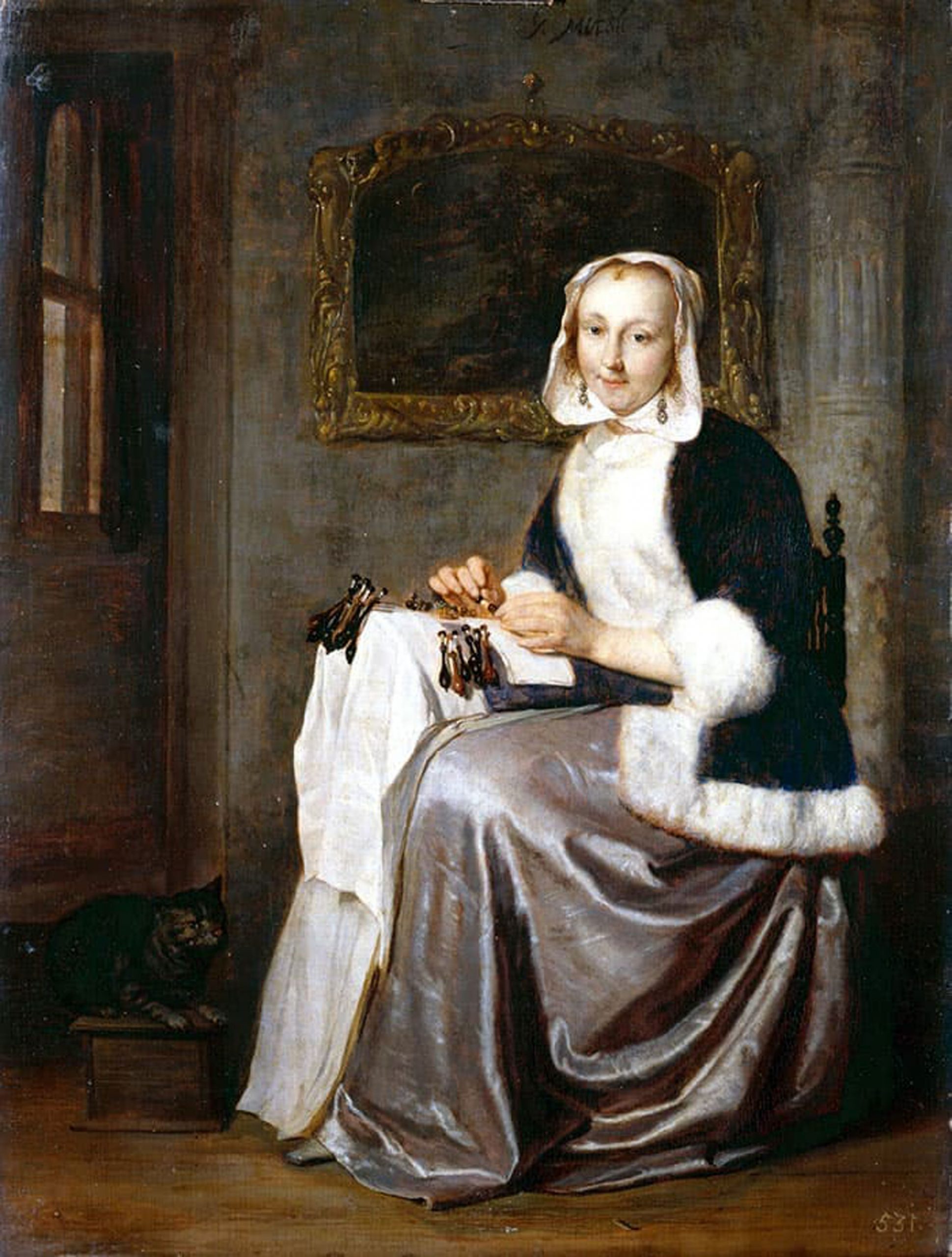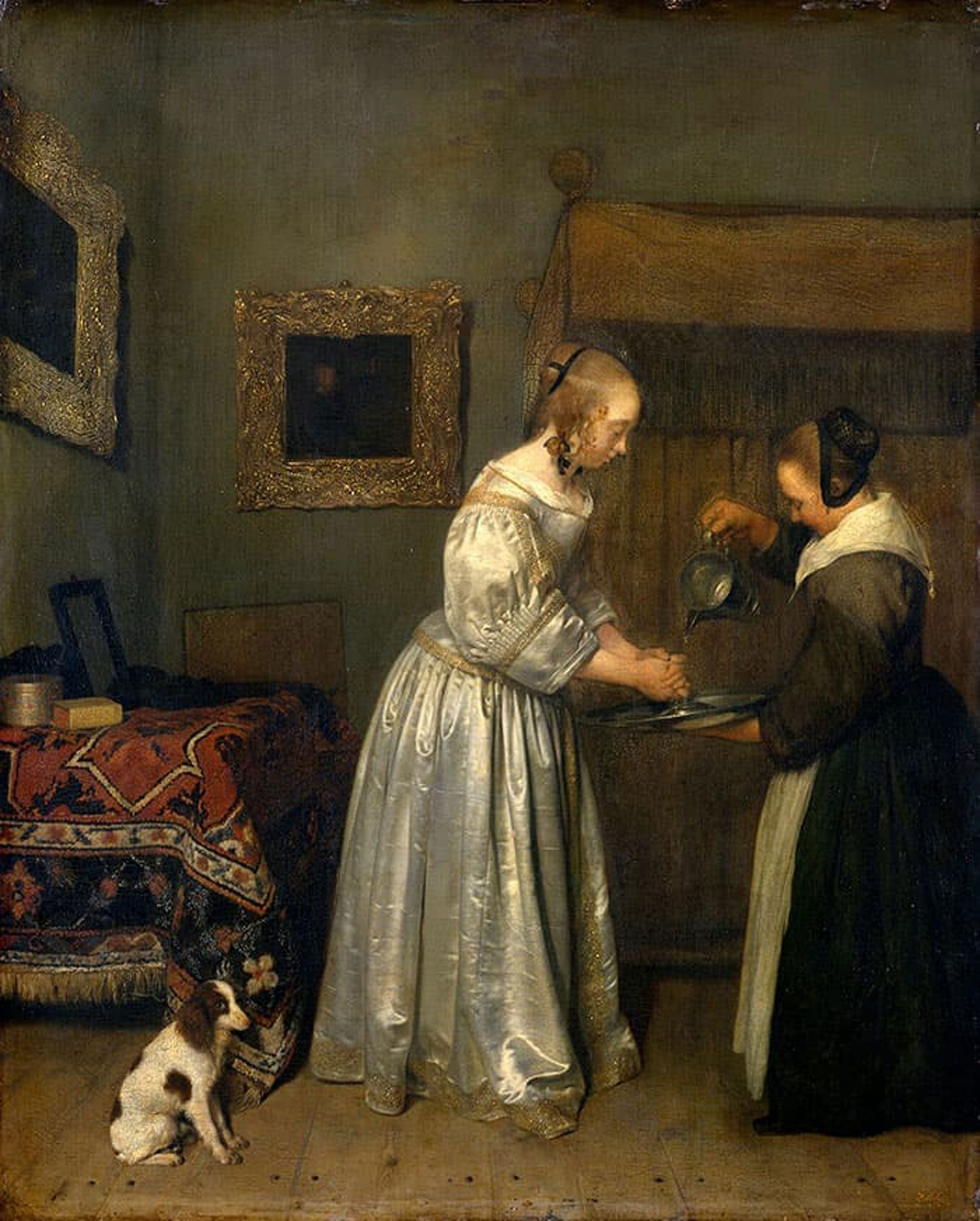 在風俗畫盛行的那個時代,家裡發生的一舉一動也被畫在室內畫中。比如格拉爾德.特鮑赫(Gerard ter Borch)的《洗手之女》,以洗手暗指不潔與污穢,一手洗著另一手也代表著有外在感情介入的愛戀。另一幅蓋布瑞・梅茲的《編蕾絲之女》,則是以銀色絲綢群來展現當時重視的光線。家中女子忠勤嫻熟地編織雷絲的同時,象徵多產、誘惑者的貓卻緊隨在旁,腳部暖氣機也有不名譽的性意味,乍看衝突卻也潛藏著勤勞的人們也有其慾望。