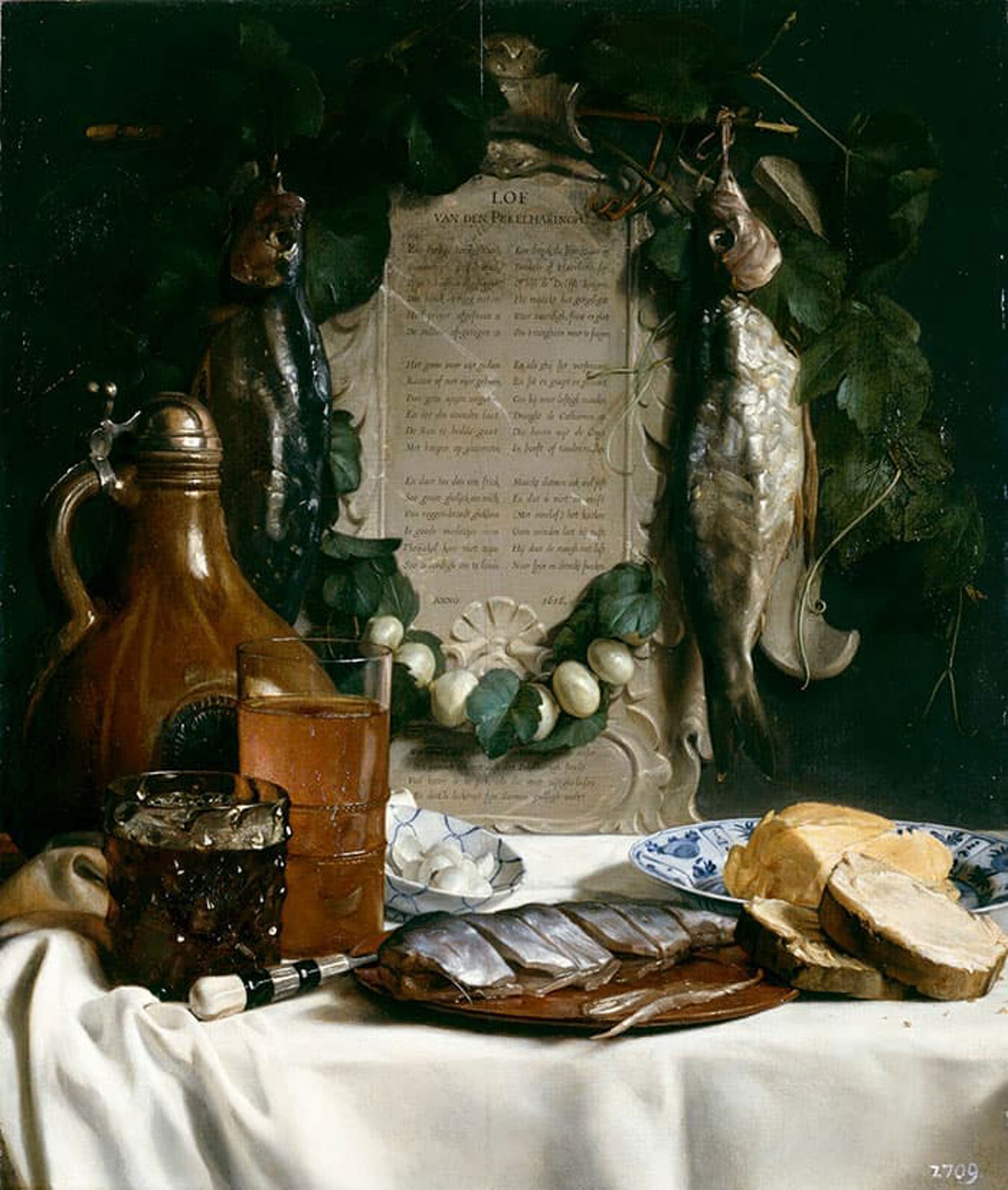 靜物畫方面,隨著國際貿易的往來,海運要衝的城市裡販售的奇珍異寶,正影響著靜物畫的題材變化。當時的人們特別喜愛選擇有中國陶瓷、威尼斯玻璃與南國特色物品的畫作,以顯高貴,如約瑟夫.德.布雷 (Joseph de Bray)的《名為鯡魚的靜物》裡,正有東方質感的瓷器。另外畫中的鯡魚是當時平民喜愛且經濟的食材,後面石碑則刻有畫家祖父讚頌鯡魚解宿醉的詩詞。用圍繞的啤酒、麵包與白布來襯托銀色魚的質感,也可以與前面《編蕾絲之女》的光反射、銀色使用手法做比較。