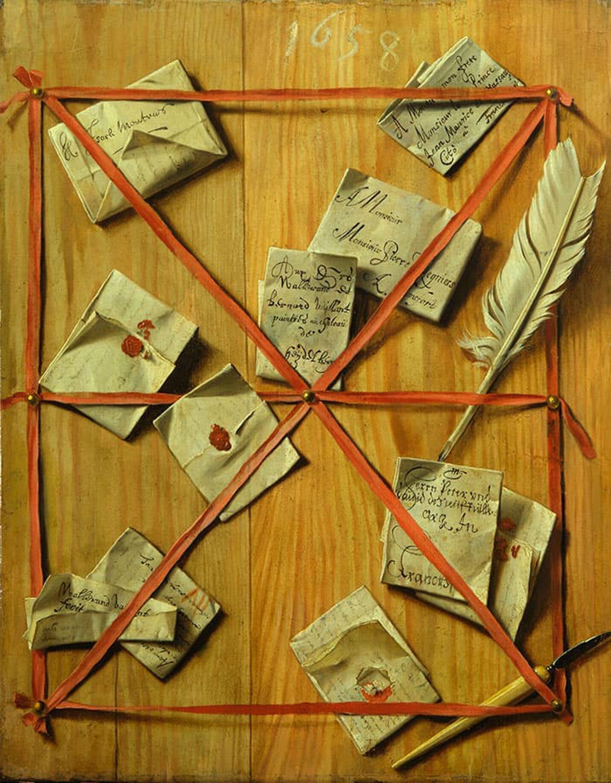 瓦勒朗.瓦蘭特 (Wallerant Vaillant)的《固定信紙、鋼筆、羽毛筆的紅線信夾子》裡,畫家選用平面的物品:拆封過後的信紙、正在撰寫的信紙、羽毛筆,來更輕易展現被固定的效果。大膽的紅線構圖外,上方仿白板筆筆觸寫的製作年代與木板紋路的細緻描繪,讓人幾乎看不出來是17世紀用油彩帆布作品,為靜物畫帶來跨時代的表現。