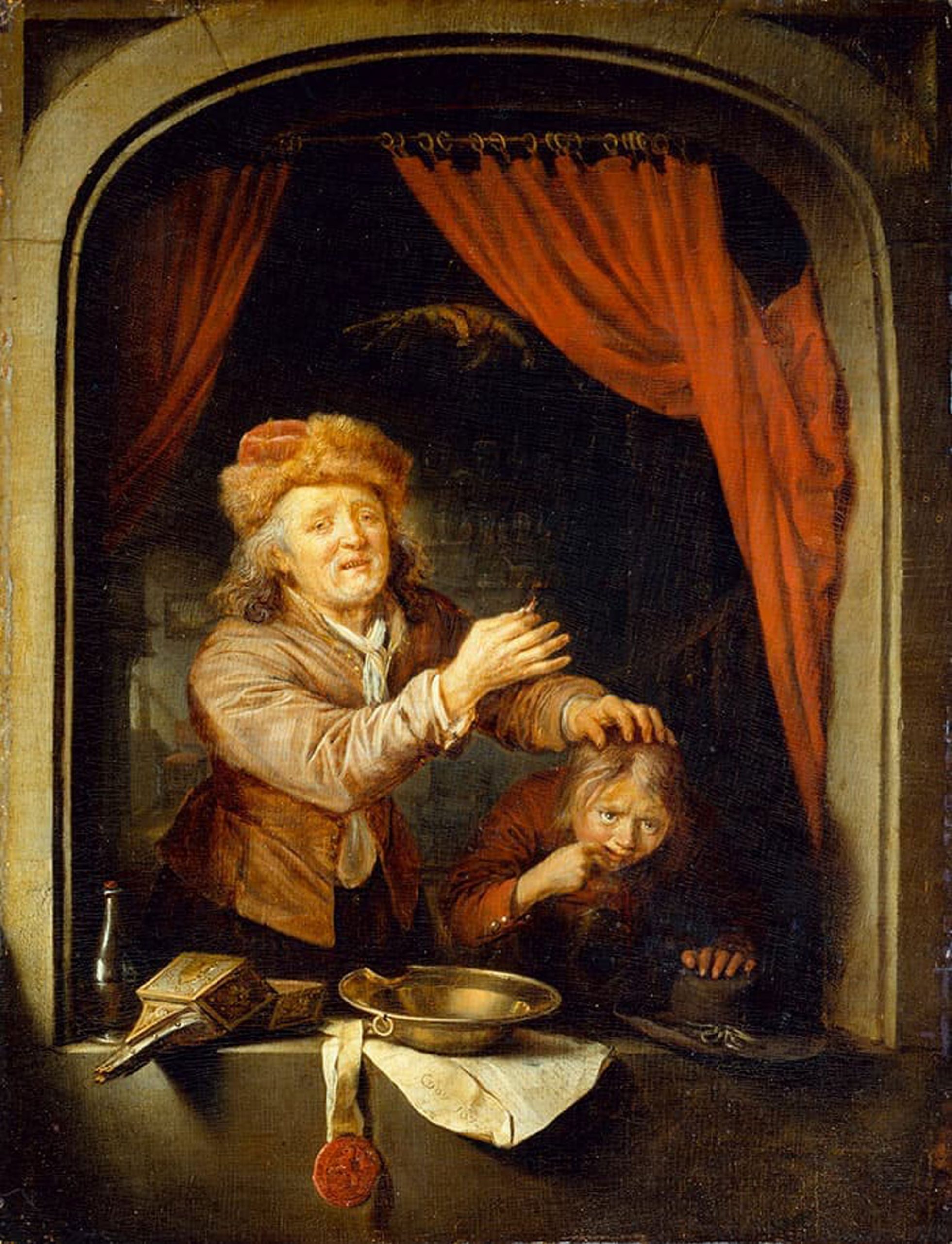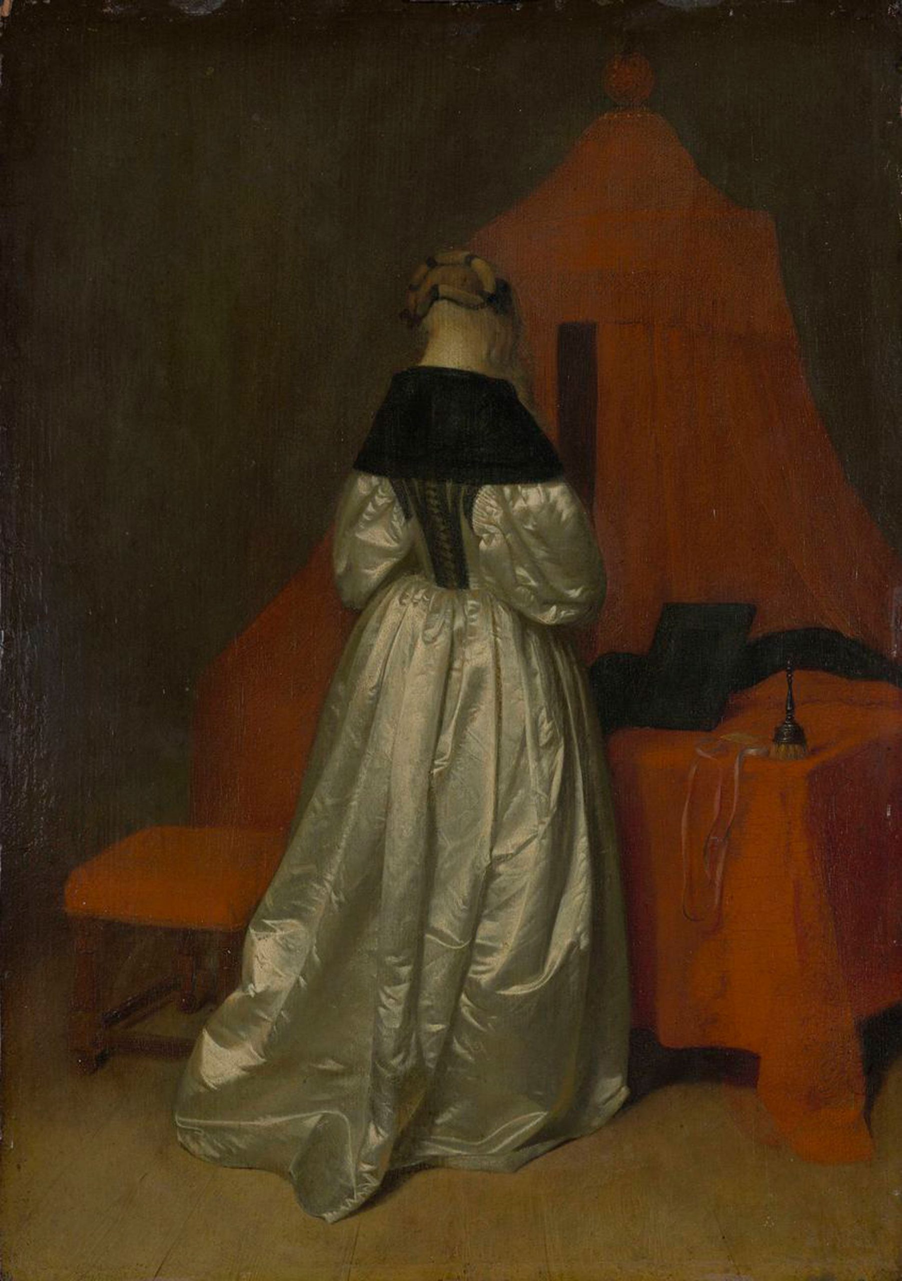 早在《窗邊讀信的少女》發表之前,就有一群畫家關注女性專注自我世界的樣態,如擅長描繪女性著裝準備的格拉爾德.特鮑赫(Gerard ter Borch)。身穿白衣的女主角背向觀眾、專注面向鏡子整理儀容。然而從全黑的鏡子裡我們看不見其長相,也正代表著追求美貌的虛榮心伴隨而來空虛感。