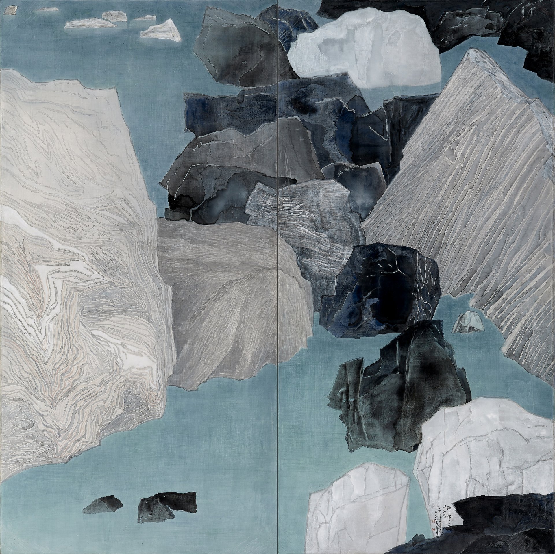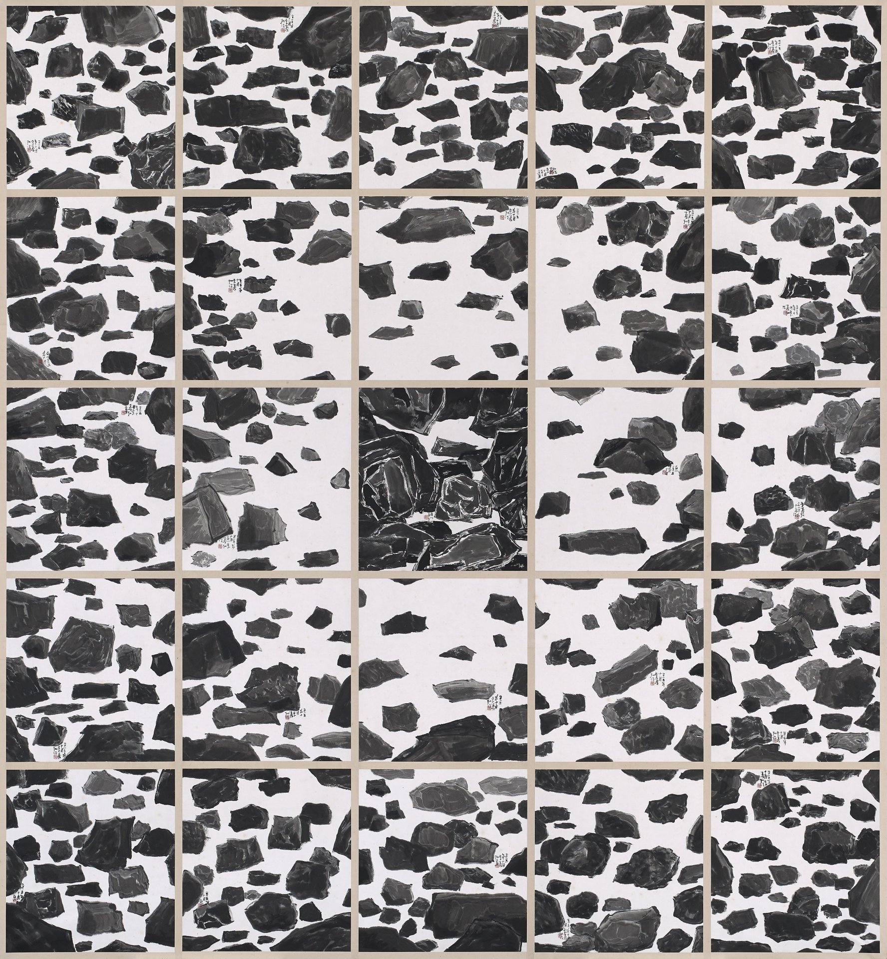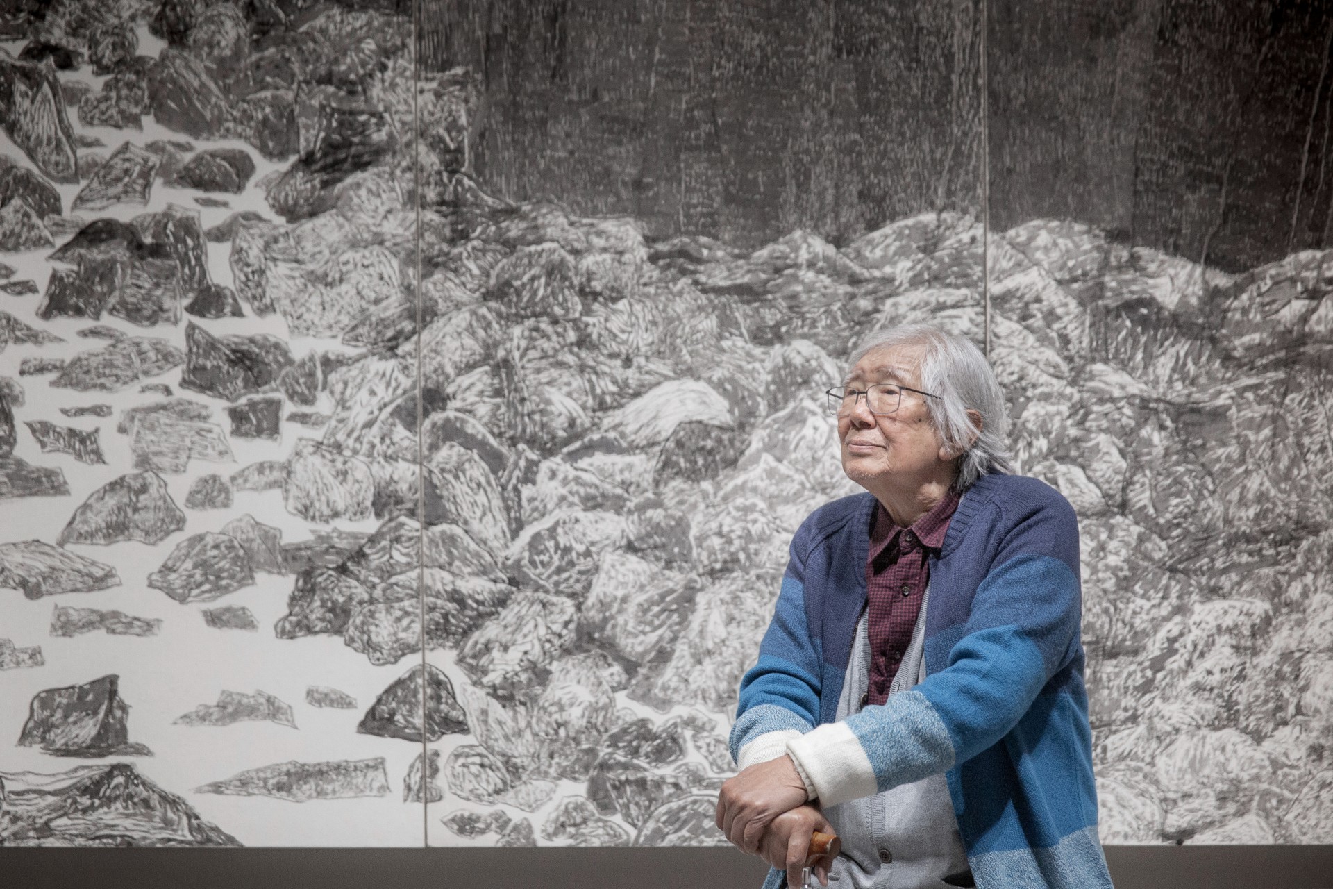 然而,石塊的局部放大、布置錯落,是否在某種程度上,也遙遙呼應了戰後台灣對藝術現代化的追求?李義弘提到自己確實在求學時期與劉國松、秦松等人有過互動往來,也還記得兩人為了繪畫理念相互抬槓的情景,某種程度而言,他也是台灣戰後追求現代主義風潮中的見證者。但比起追求所謂「現代性」的繪畫特質,李義弘毋寧更著重在自身繪畫技術與材料掌握的能力,在時間與技術的積累下,一旦時候到了,便能夠水到渠成。就如同李義弘所說:「我從傳統步入當代的繪畫領域,就像人的成長隨著時代轉變而演進一樣的自然。」