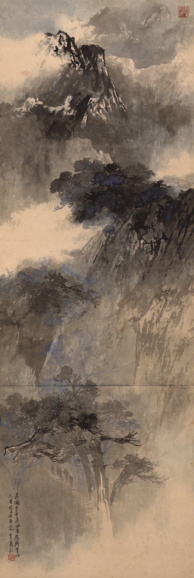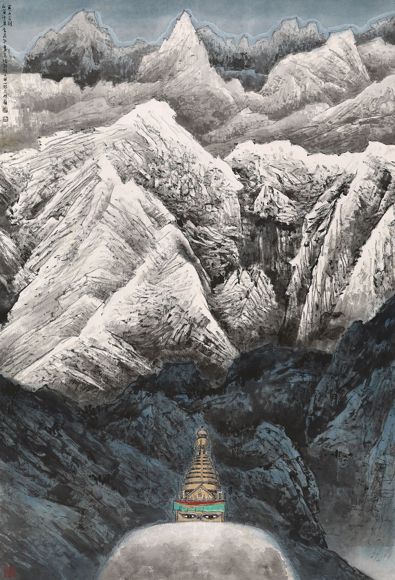 1980年代起,李義弘有機會出國遊歷,接觸世界各地的山川景色,促使他在既有的古典山水技法中,轉化出具有個人面貌的山石肌理表現。像是展覽一進去首先看到的《寒山古剎》,畫的是尼泊爾境內的喜馬拉雅山脈,白雪罩頂的高聳山勢,配上藏傳佛教寺院的塔身,極具氣勢與張力的畫面手法,已然與傳統山水造景的布局大不相同,但在山石處理上,又可見到李義弘紮實的筆墨工夫。王嘉驥稱為「乾坤挪移般的結合」,也可見到李義弘在山水構圖上意欲突破的企圖。
