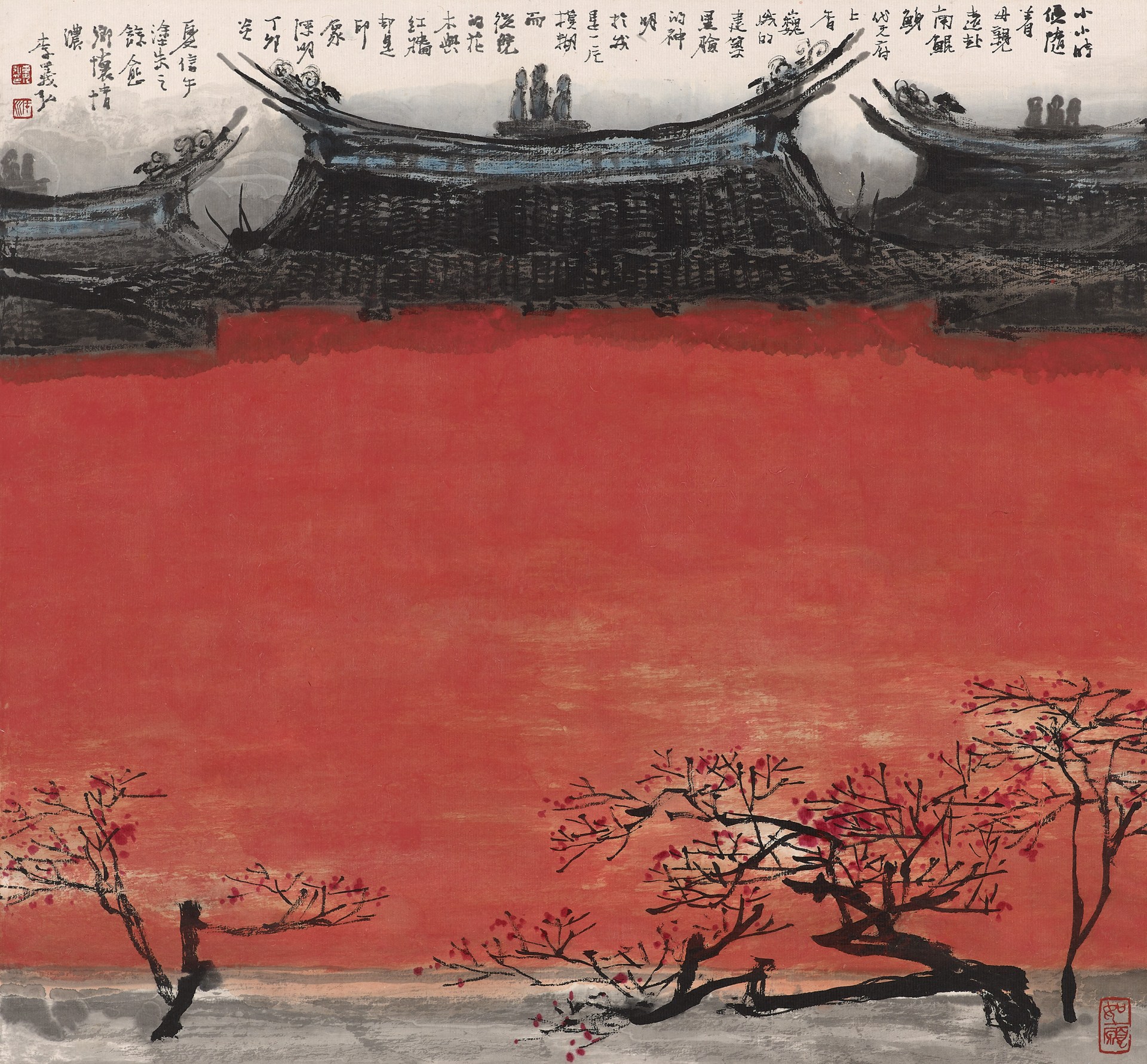1970年代在國際環境的變化下,台灣文學界發起了鄉土文學運動,對台灣這塊土地的自我挖掘與追尋,也影響了畫家在題材上的關注。李義弘出身台南鄉間,對台灣土地自有一份深厚的情感。雖然李義弘在江兆申門下,延續了傳統文人畫創作的傳統與思維,但在現代社會接受學院出身的藝術創作者,實際上已經不復過去古代文人的社會背景。師古人的「造景」概念,勢必要漸漸過渡至師造化的「寫景」當中。因而自1970年代晚期後,李義弘遊歷台灣各處,以台灣景色為主體,繪製出許多作品,像是台南老建築的紅牆黑瓦與參天古木,墨色與朱色在畫面上呈現衝突的戲劇感,兼容在地情懷與文人情致。