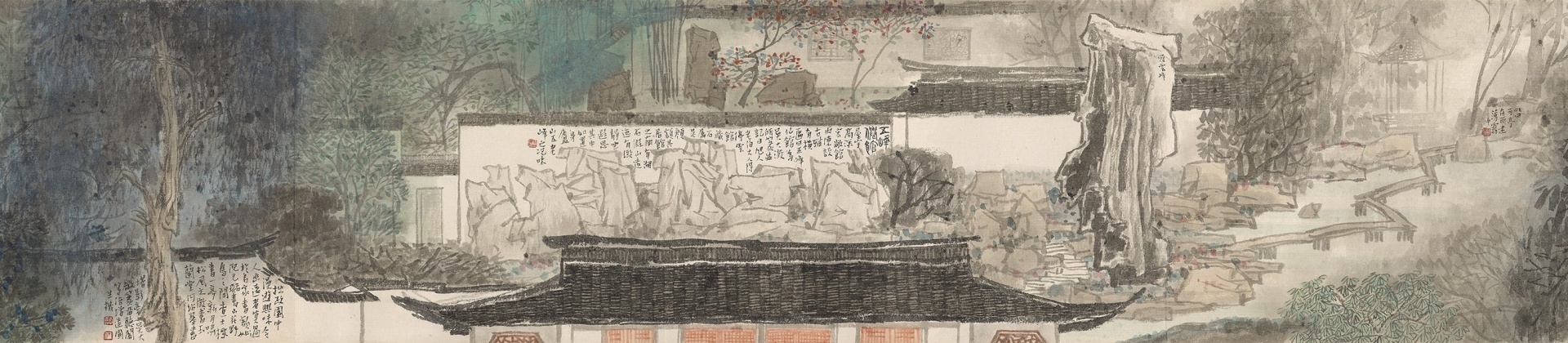 王嘉驥也選了李義弘2001年遊歷江蘇、浙江、安徽等地後所繪製的長卷《吳越江淮》。此卷作品將其所遊歷過的豫園、拙政園、周莊等人文景色,以及沿路所見的山巒河景鎔鑄為綿延畫面。由於北美館場地難得的空間闊度,王嘉驥在規劃展示時將長卷完全開展,得以讓觀眾飽覽由藝術家特意經營下的長卷畫面。此次「回顧展」共展示六件長卷,全數展開,在數量與展示方式上皆屬空前。
