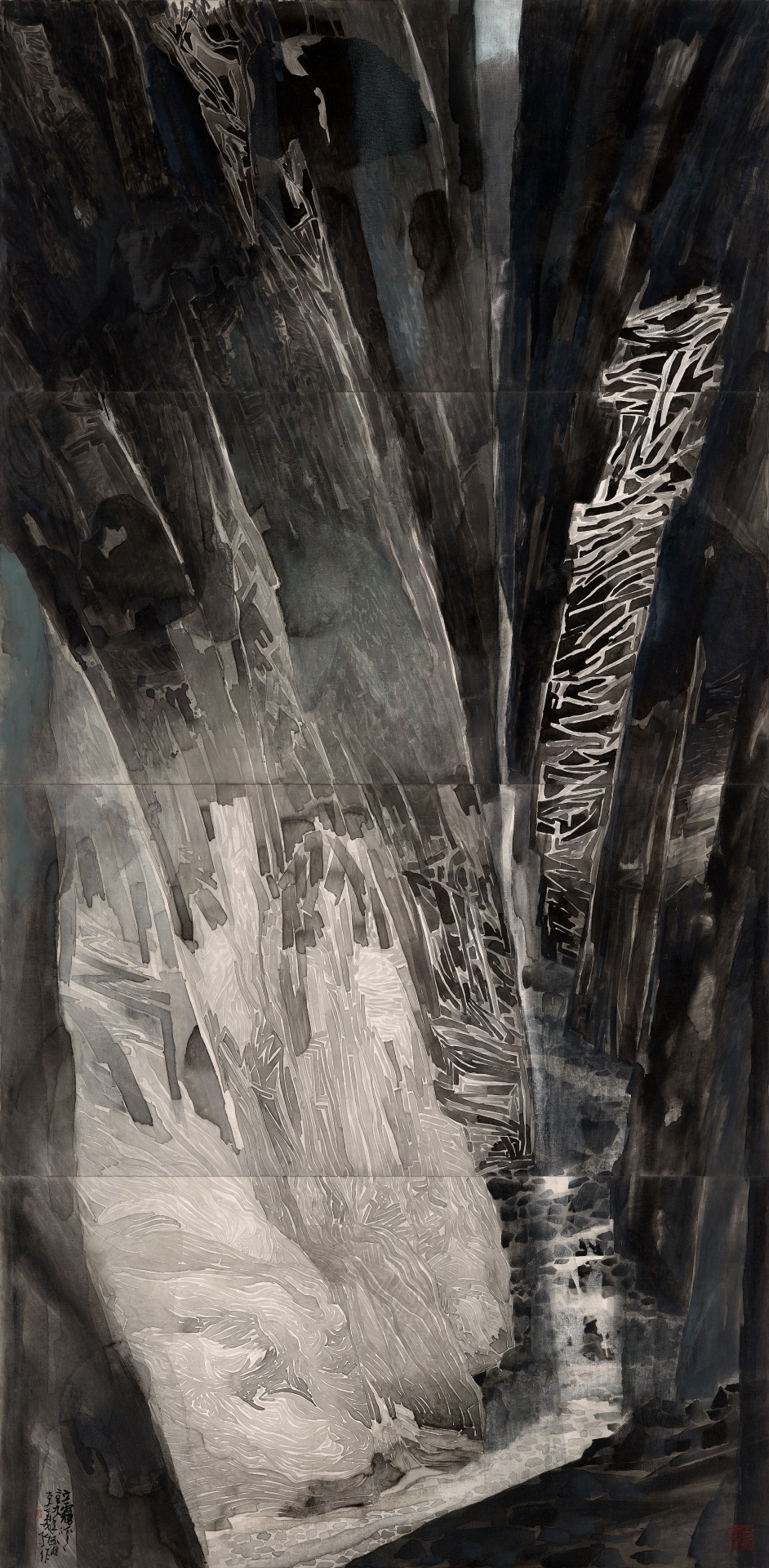 除了北海岸的風稜石景觀,花蓮太魯閣立霧溪兩岸多變的峽谷風光,也是李義弘近年著力甚深的題材。除了山高水深的壯闊景色,立霧溪旁因受到地層擠壓而產生紋路繁複的大理石,也成為創作表現的主要重點。李義弘提到,水墨並不強調西方的光影明暗,而是以線條用筆來展現出物質的質感與量感,這是東方筆墨的特殊之處。而如何從眼睛所見的塊面轉化成筆下的線條,便是功力所在。因而在處理太魯閣等山石時,透過不同的線條表現,或是堅硬光滑,或是深沉粗糙,在僅有山石組成的畫面當中,呈現出多層次的視覺趣味。