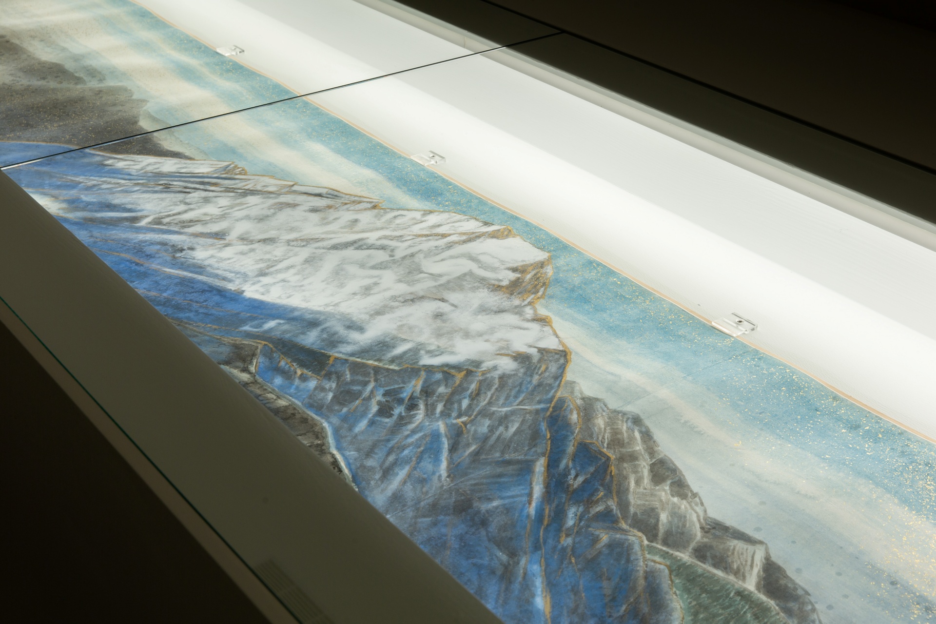 王嘉驥也提到,李義弘在繪製《玉山行》長卷時,用的是江兆申過去專門訂製的礬宣。然而因時日久遠,紙面已有脫礬情況,出現明顯的斑點痕跡。為了不讓這些痕跡影響畫面,李義弘在繪製之餘,更用了灑金的方式,讓畫面層次變多,減低脫礬所帶來的干擾,這些都是李義弘長期實驗材料、找出方式應用所發展出來的繪畫技巧。甚而面對不同的畫幅形式,進行不同的布局處理,如面對同樣的景致,以橫卷或冊頁的方式表現,重點與取捨即有不同。這些技術應用上的調適與掌握,對李義弘而言同樣是創作的一環。