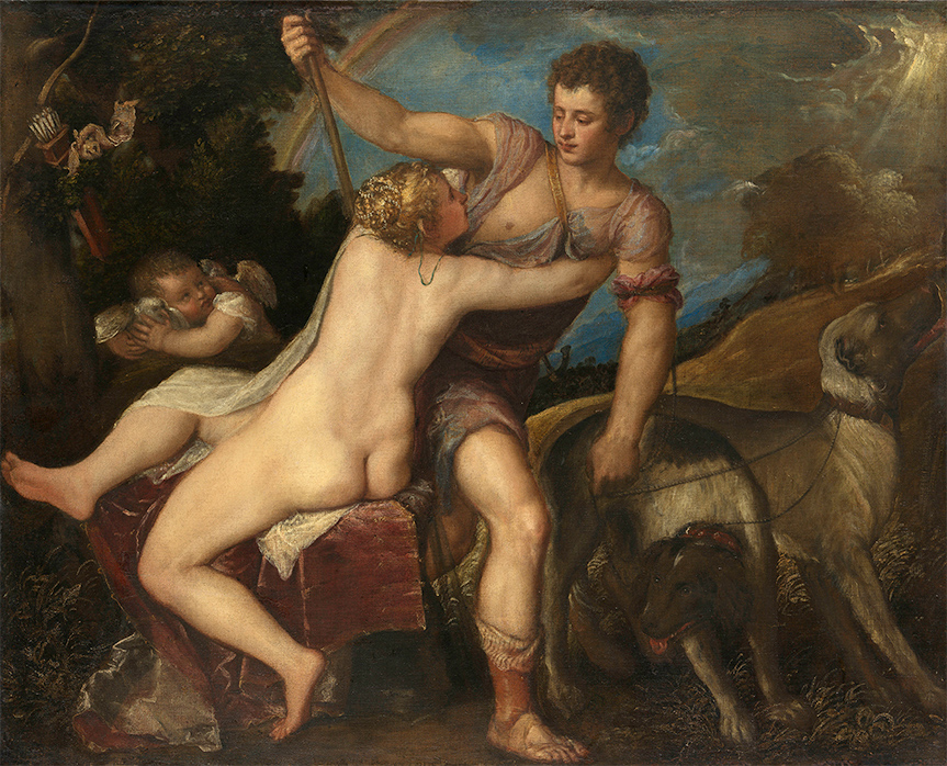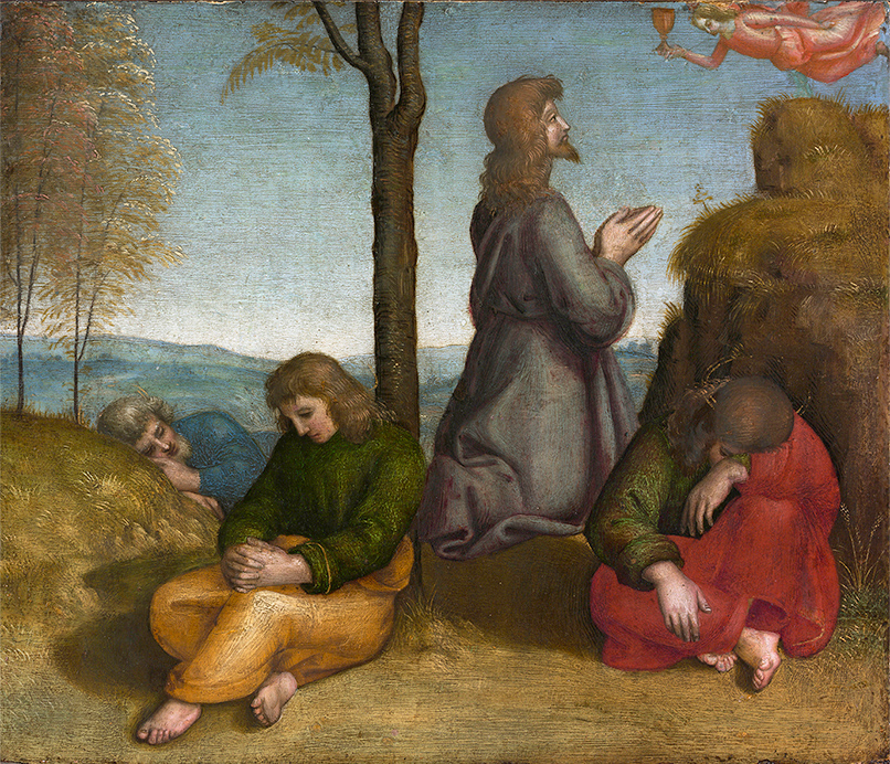 第一部分「信仰與文藝復興」裡,將焦點從平面、超然的宗教繪畫,轉移至以人為本、重視透視技巧的文藝復興繪畫作品。雖然描寫對象仍以神話、宗教人物為主,人類擁有的七情六慾卻滿溢畫面當中。如拉斐爾(Raphael Sanzio)在20歲時繪製的《客西馬尼園中的禱告》。根據《聖經》新約記載,耶穌基督和門徒在最後的晚餐後,基督帶領門徒到橄欖山上的客西馬尼園。對比著熟睡的門徒,基督虔誠祈禱在稍後得以有足夠的勇氣面對釘上十字架的磨難。而提香(Tiziano Vecellio)的《維納斯和阿多尼斯》,則是描寫維納斯勸阻想要狩獵的阿多尼斯(Adonis),然結果就如維納斯不幸的預感,阿多尼斯在狩獵中被野豬傷足身亡。這個悲劇故事在文藝復興時期風靡一時,也可以從中看見當時在追求科學與真理的同時,也關心人類感性層面的探討。