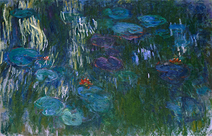 展場的最後以莫內《睡蓮》收尾。莫內從1897年開始,以吉維尼家的蓮池為主題,持續創作了30年,並於1915年起嘗試繪製大型裝飾畫。沒有遠近感的畫面裡,天空與湖水、蓮花與倒影混和在一起,表現出既真實又寫意的景象,或許是當時患有白內障的莫內看到的模樣。這樣的畫風也對接下來的抽象、前衛藝術影響深遠。