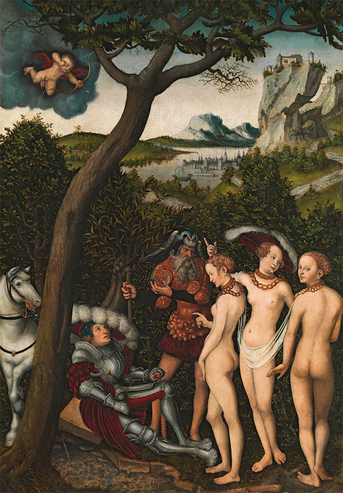 北方文藝復興的代表之一─老盧卡斯・克拉納赫(Lucas Cranach der Ältere)的《帕里斯的審判》,是16世紀日耳曼地區紅極一時的繪畫題材。特洛伊王子帕里斯(Paris)必須在天后赫拉(Hera)、智慧女神雅典娜(Athena)與愛神阿佛洛狄忒(Aphrodite)三位女神中,決定誰應該獲得擁有最美麗象徵的金蘋果,最終他選擇了維納斯以換取人間最美女子海倫的愛情。在這件作品中,水晶球取代了原先的金蘋果,並用正面、側面、背面增加女性不同面向的美感。盔甲、寶物、茂密植被,蜿蜒山景等描寫,也明顯比前面介紹的作品具體細膩,可以看到北方文藝復興與義大利的相異之處。