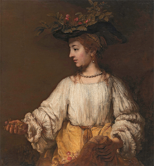 另一幅是林布蘭的《花神佛洛拉》。象徵春天、鮮花與富饒女神的佛洛拉自文藝復興時期以來即是熱門的繪畫主題,擅長宗教畫與多人肖像畫的林布蘭,以已故十年妻子薩斯基亞的臉龐作為女神的樣貌,一展大師筆下的深情繾綣。