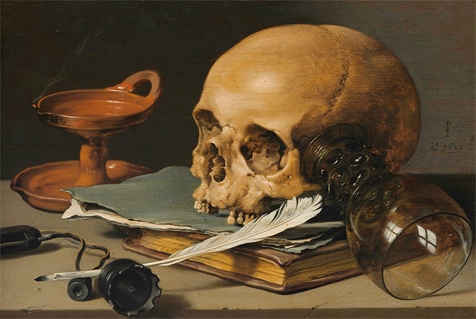 肖像畫盛行的同時,靜物畫主題也形成獨立類型。如彼得.克拉斯(Pieter Claesz)作品經常藉由描繪的靜物隱喻生命、富貴、權力的無常。《有頭骨和羽毛筆的靜物》裡的書本意味人類努力積累的智慧與成就,然而卻被象徵死亡的骷髏壓住,左方油燈邊緣僅剩一縷煙裊裊升起,如同人類留在世間的貢獻與時間付諸流水,極具警世意味。