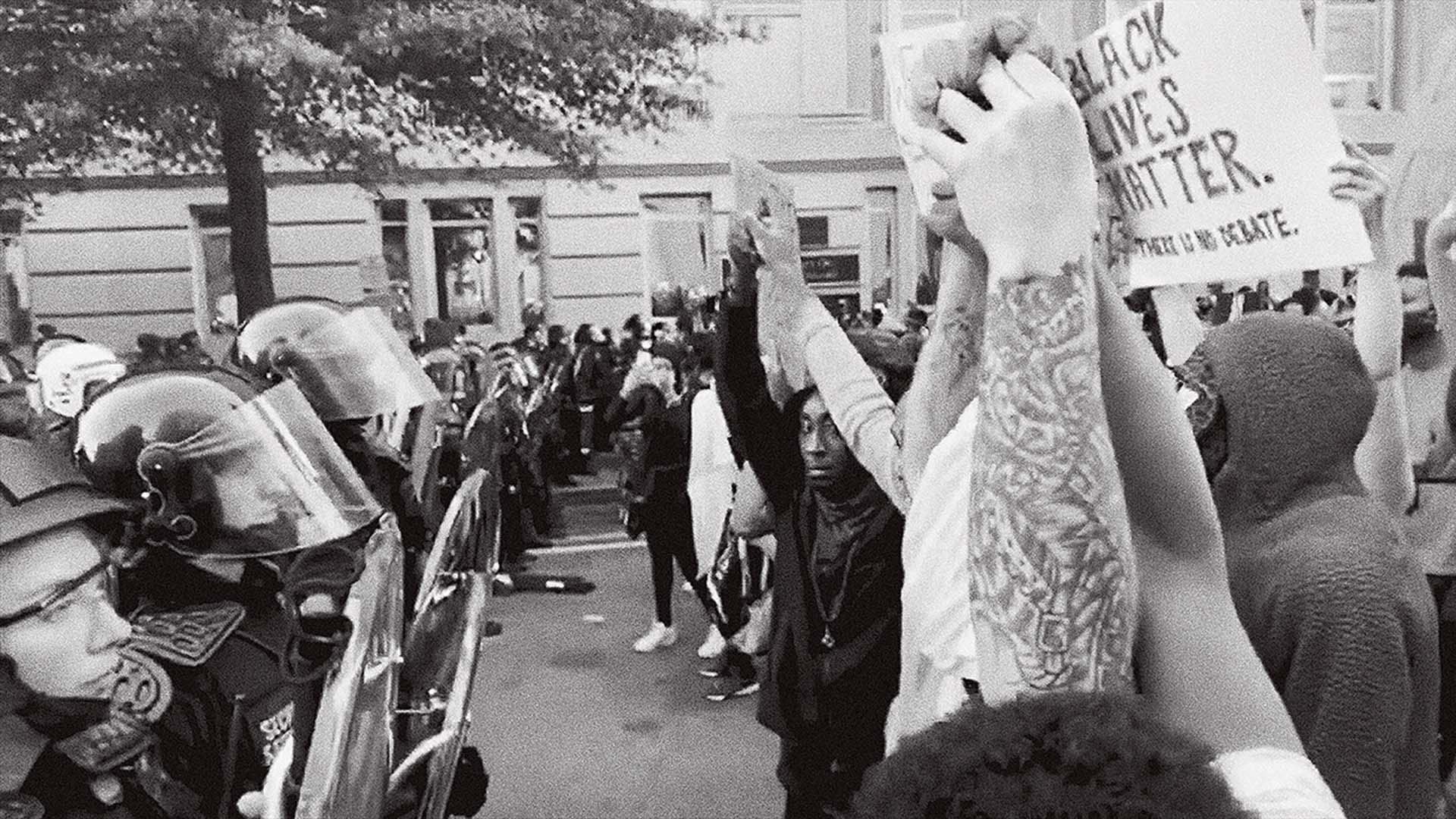 藝術家阿爾弗雷多.賈爾(Alfredo Jaar,出生於1956年智利)的作品《2020年6月1日,18點39分》(06.01.2020 18:39, 2021),同樣地要求觀者的耐心與專注力。據博物館學者統計,平均每一位觀眾觀賞作品的平均時間是30秒,然而此處,賈爾想再多跟我們要一點時間——在他的影片前待滿六分鐘。賈爾的影片乍似典型地安置在黑盒子(六樓展區特別設立的空間),以他手機的自攝畫面夾雜新聞影片,重演藝術家在兩年前,喬治.佛洛依德為警察殺害一週後,前往華盛頓特區抗議的現場。看似尋常的和平抗議活動,很快地遭受警方的反擊:當時的川普總統,為了於聖公會教堂前手持聖經拍照,而下令聯邦武力開道。我們看著這些再熟悉不過的畫面:警察投擲催淚瓦斯、橡膠彈,抗議群眾有得試圖反擊、有的找掩蔽。如果是兩年前曾經在現場的我們,可能會被換起些許創傷記憶:激動混雜著恐懼,仿若是戴著口罩,在炙熱的美國東岸六月裡,自己粗重的呼吸聲和群眾的叫嚷逐漸產生共鳴。