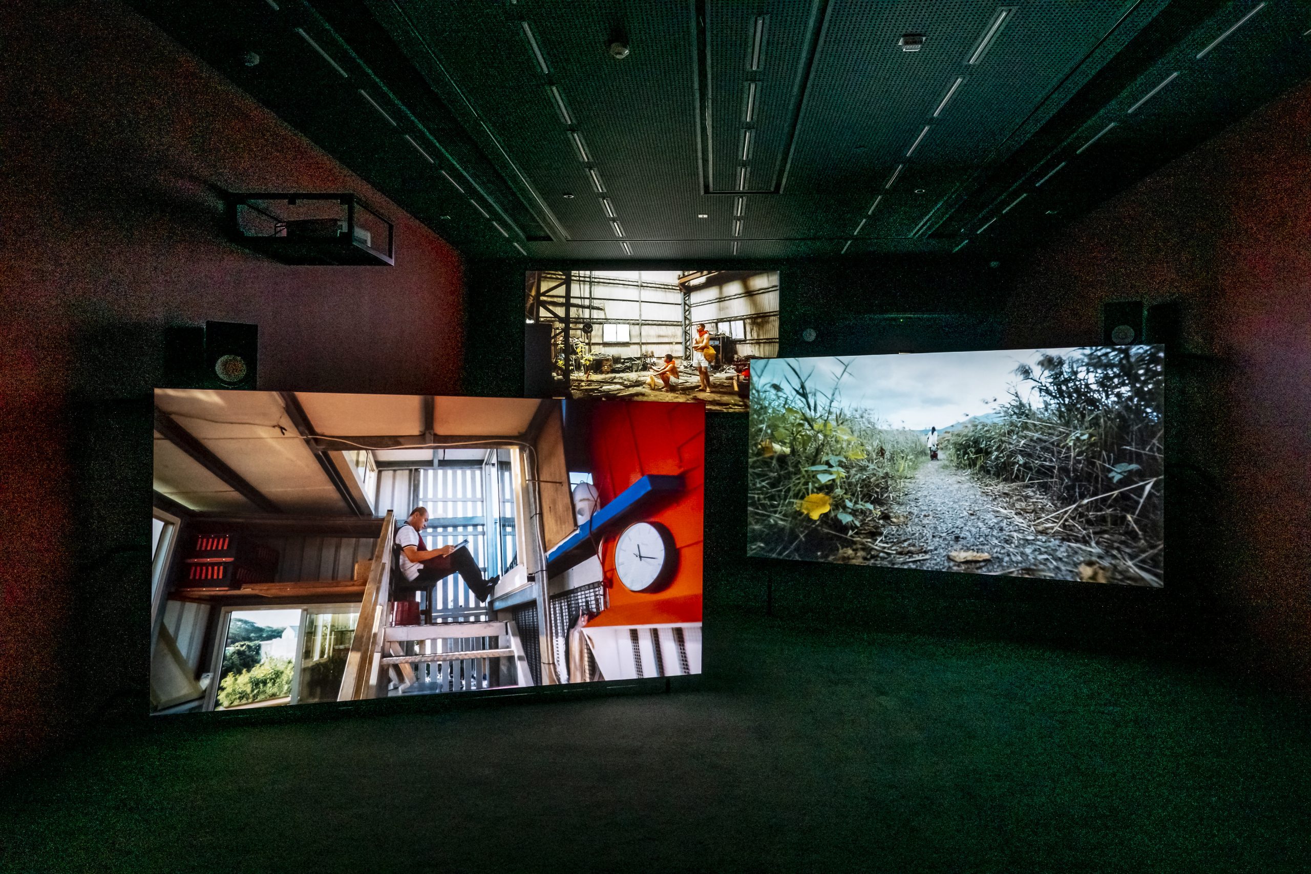 至於朱駿騰《河鰻》雖然沒有明顯的「紡織」元素,但王慰慰認為每一位參與的藝術家都是紡織者(weavers),「與我共同編織出這個展覽,和『東亞線索』」。朱駿騰把鏡頭聚焦回到現實的台灣,以社子島作為比喻,透視人們被各種政治經濟力量拉扯出無助和焦慮的困頓,反映出台灣仍是「東亞地區目前各種力量牽扯充滿張力的核心地帶」,尤其是俄羅斯出兵烏克蘭之後,台灣的地緣政治更加備受關注。
