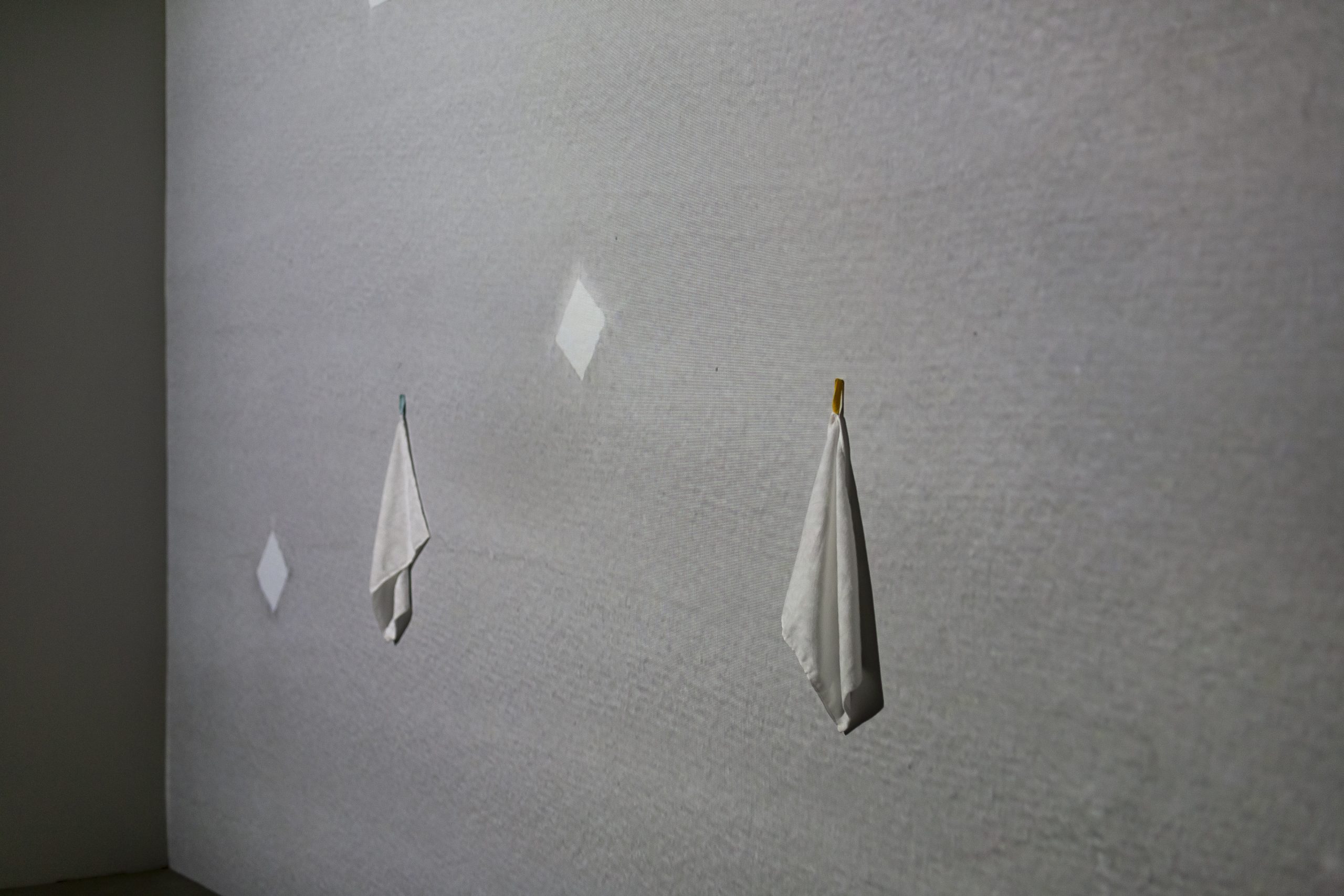 這思路在王雅慧《一一》尤其明晰。作品剛好放在觀展路線的中間,王慰慰更形容是佔著「重要位置」。一如過往的投映裝置,她在牆上掛著小方巾,利用投映重現織物染色褪色的過程,「打斷之前觀看關於東亞歷史作品後形成的思考邏輯,讓觀眾休息、靜一靜,凝視眼前緩慢變化的明暗影像,轉換一下思路的同時其實也消化一下之前看到的作品內容。」