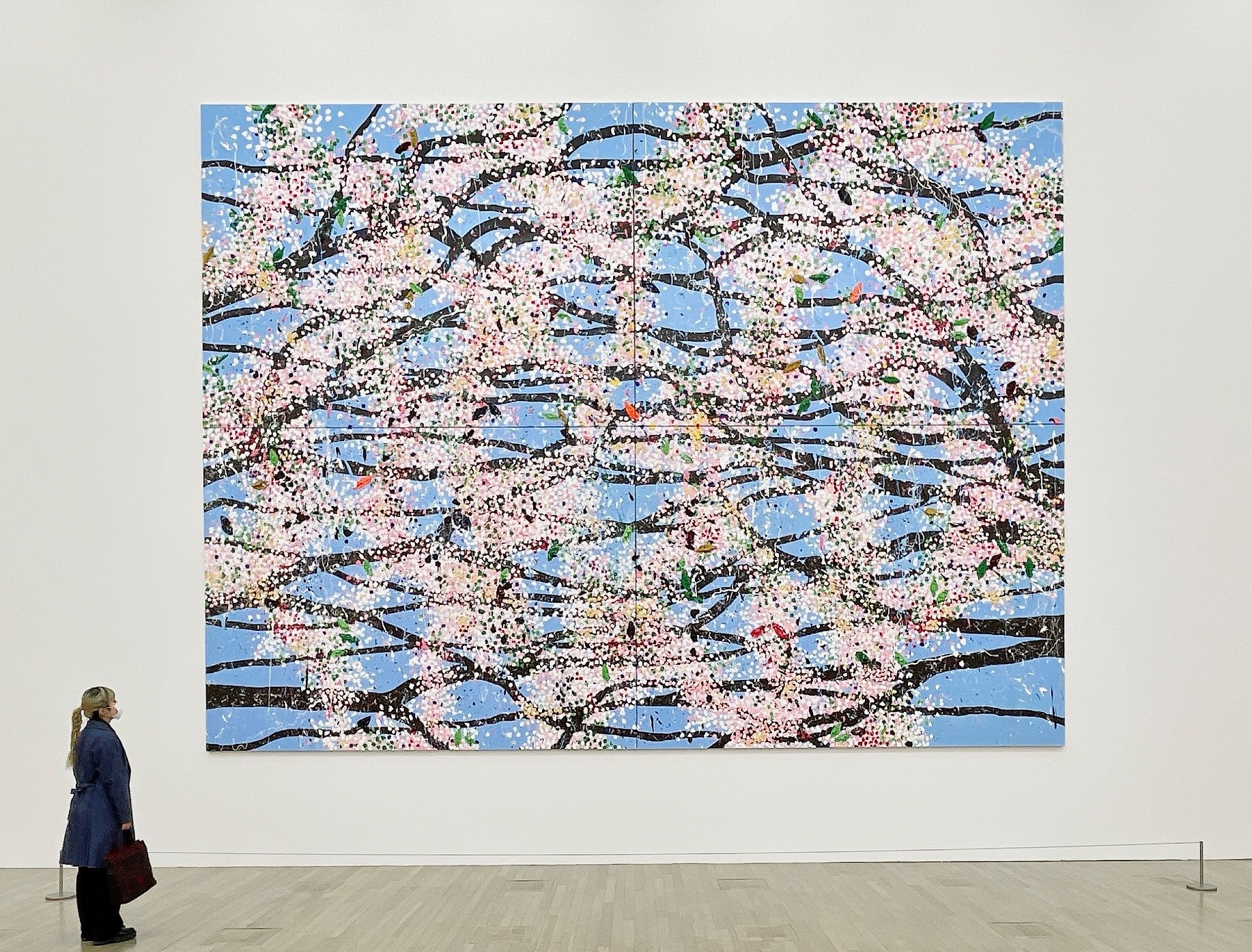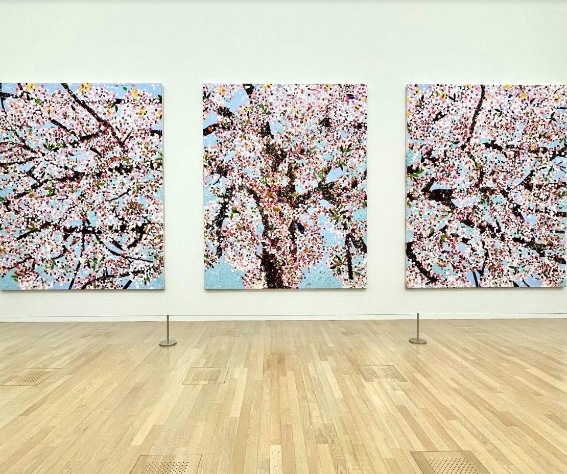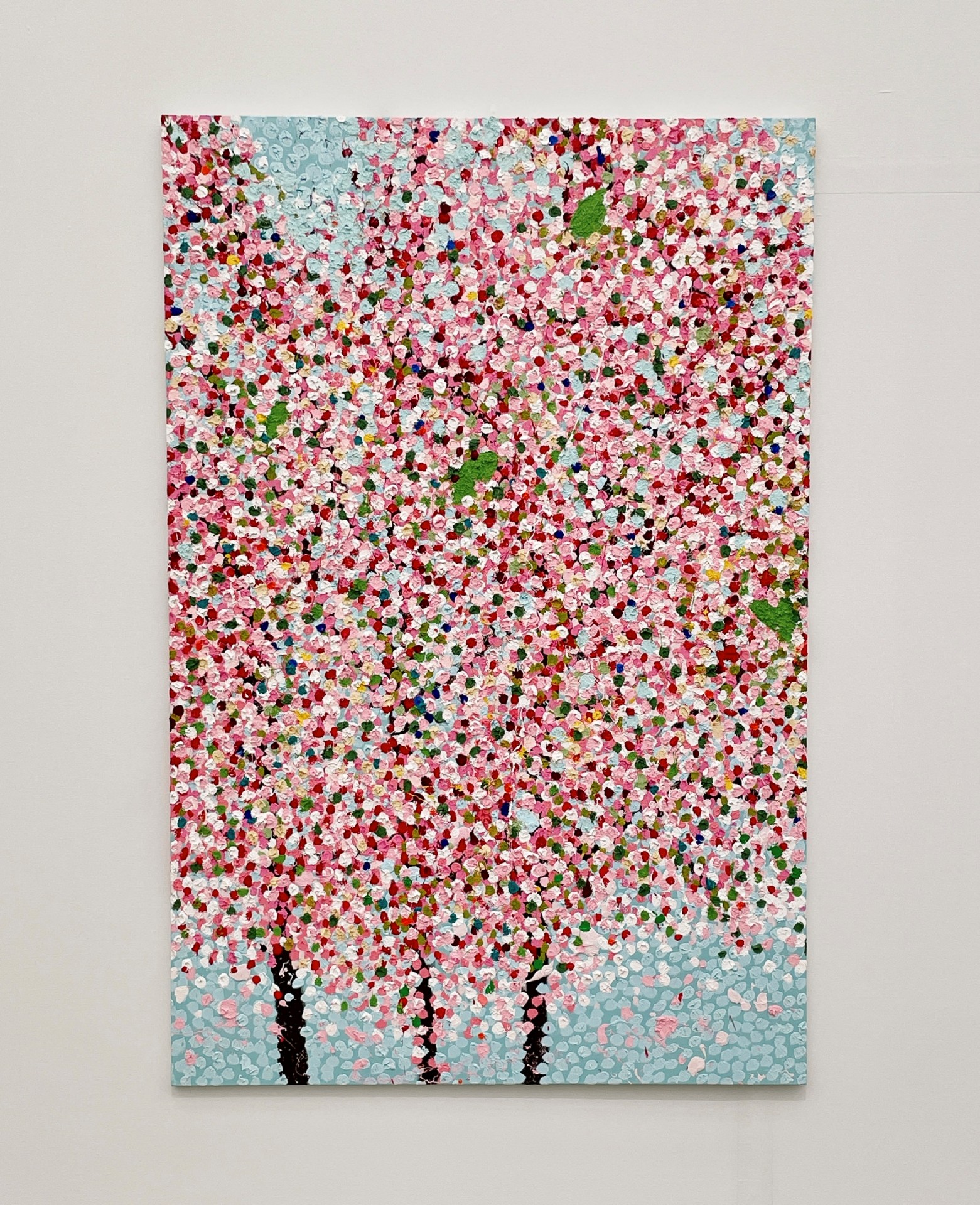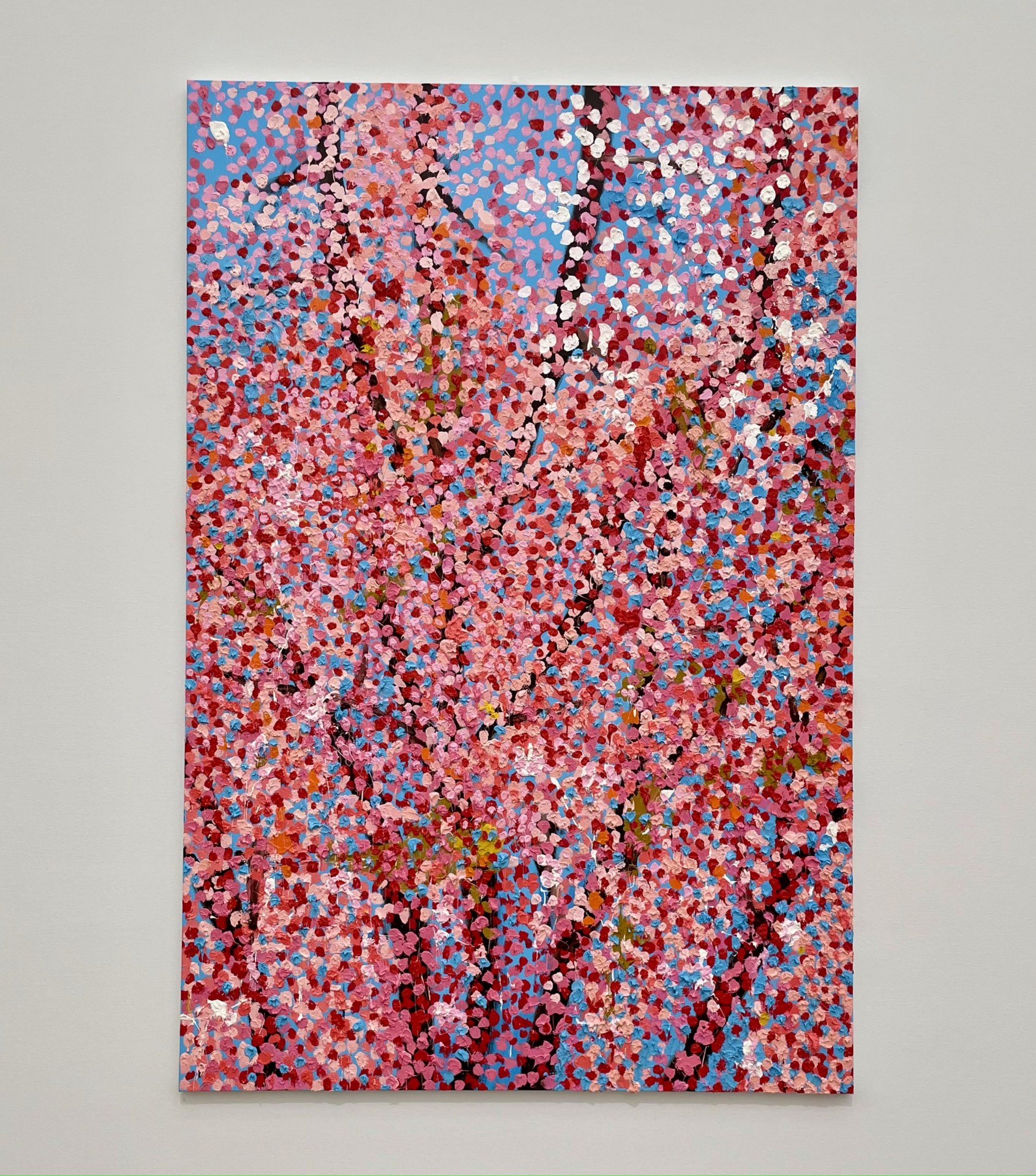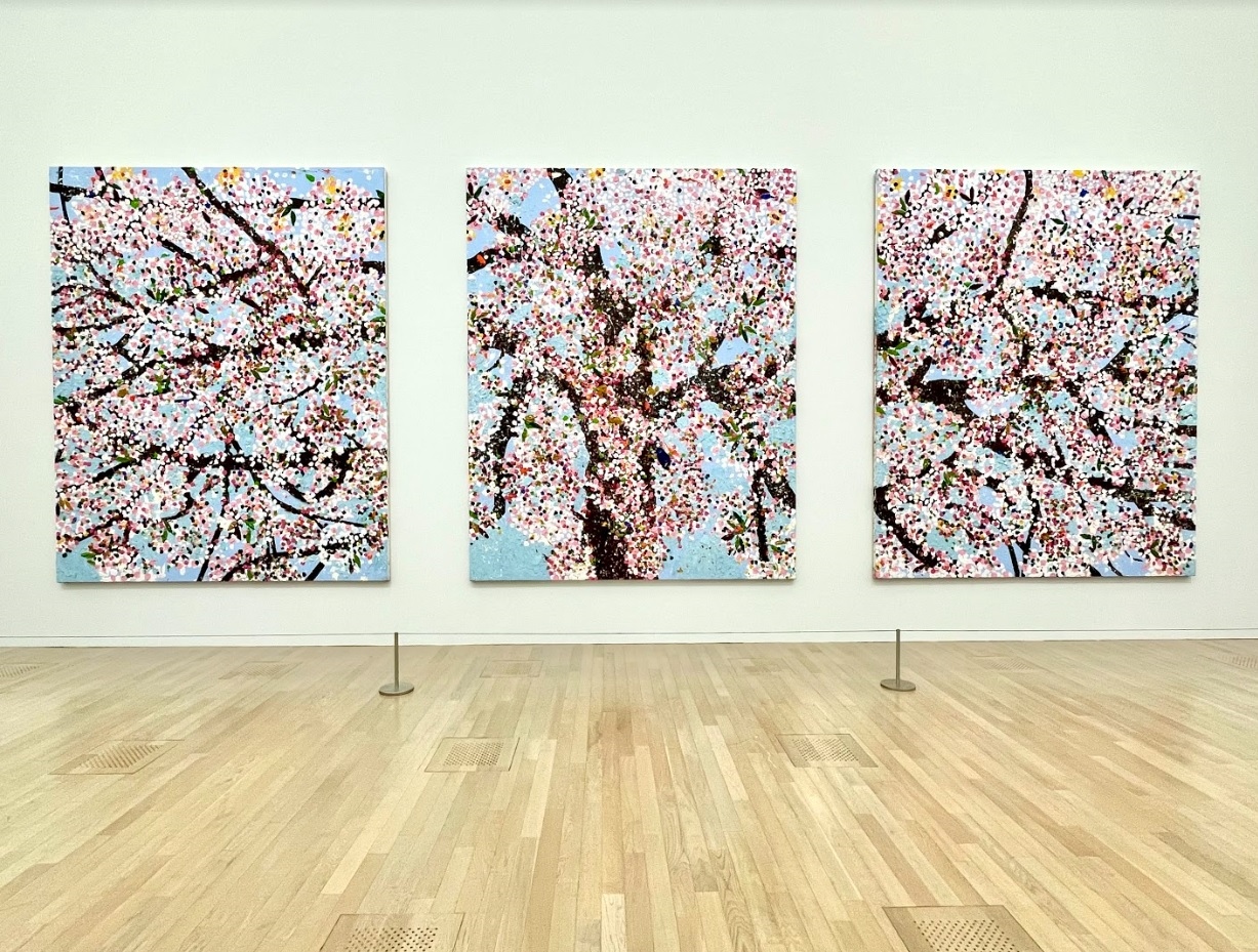 《漢字櫻》、《吶喊的櫻花》、《智慧之櫻》、《詩人之櫻》⋯⋯拜作品名稱所賜,在乍看一致的花群中得以馳騁想像,讓樹木變得性格迥異。櫻花叢叢來自赫斯特的水平投擲,克服地心引力迸砸而成的生命感,開拓出別於秀拉(Georges-Pierre Seurat)的點畫精神。擺脫以粉白詮釋花朵的既定框架,葉片反射日光的紅、綠、黃、藍呈現在畫布上,像極了味蕾裡躍動的跳跳糖。也正因為這些顏色的異軍突起,才讓視神經將點點辨識成櫻。其實這樣的創作技法是難的,他經常得提醒自己與助手去擺脫規律,不經意地拿捏時密時疏才得以巧奪天工。