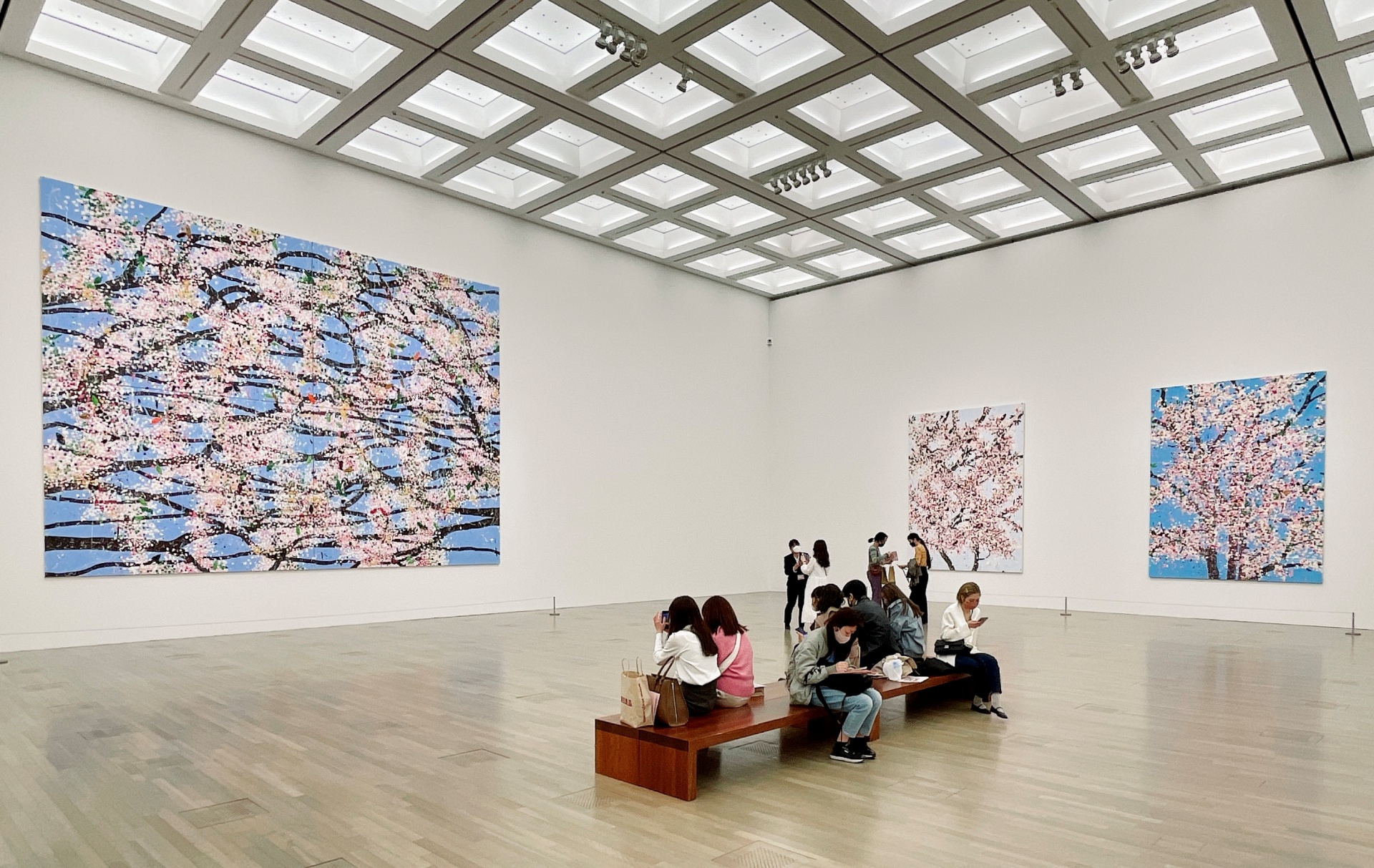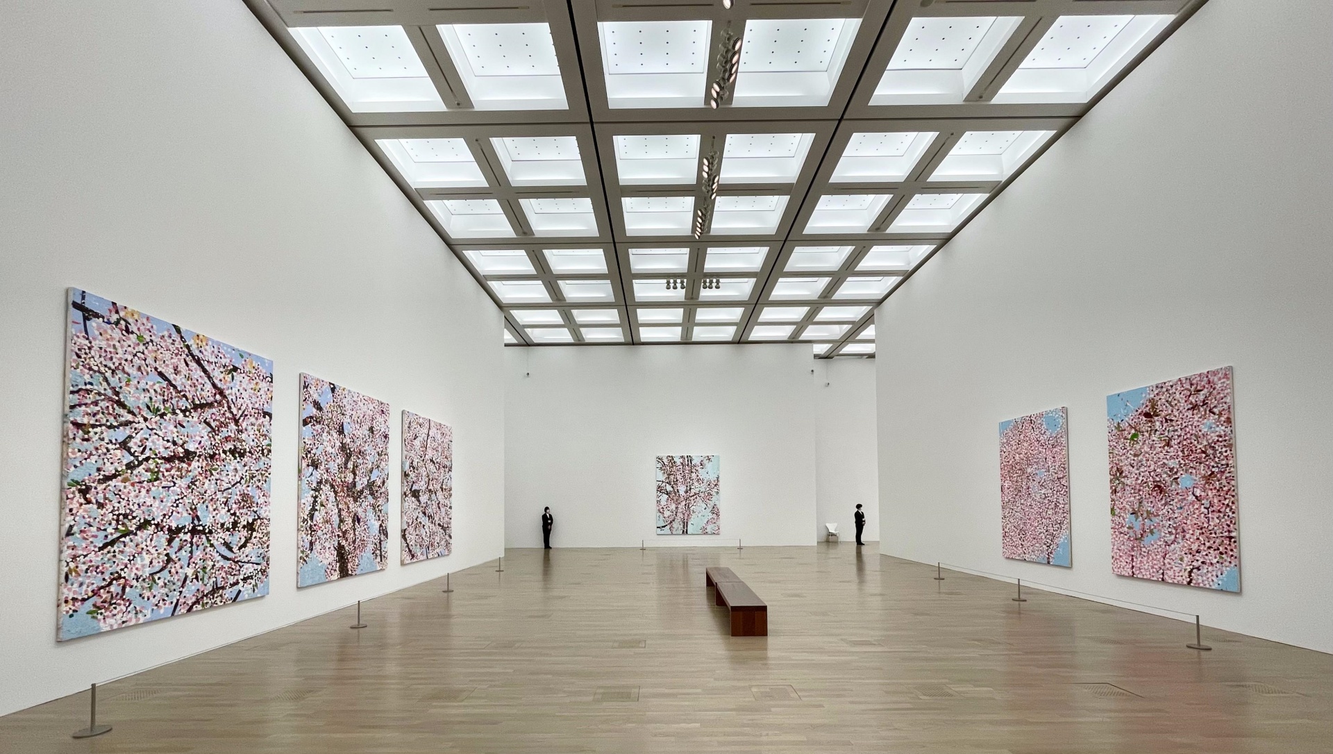 說到以櫻花為主題的作品,通常會想起卷軸或屏風上纖細的表現,然而來自「異域」的達米恩・赫斯特(Damien Hirst)筆下的櫻花卻帶來全新氛圍,成為今年春天的焦點。進入國立新美術館,與真實樹木等大的畫作四面圍繞,大家不約而同的坐在中央木椅。椅子與作品的距離,隱約連結在戶外齊聚賞花的感官經驗,巧妙模糊真實與作品的意識疆界。