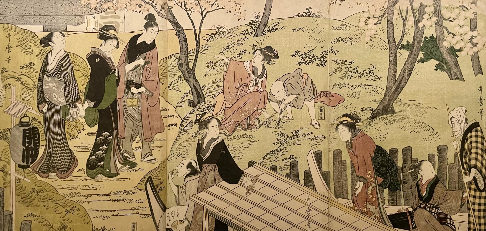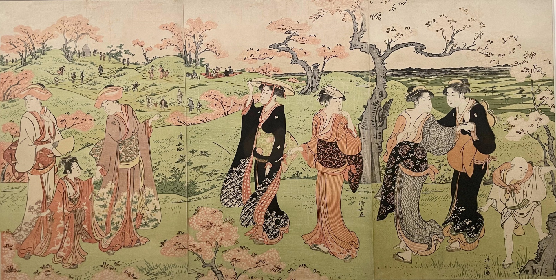 這樣的風景被收錄在同時代喜多川歌麿筆下的浮世繪中。供奉三井一族守護神的三圍神社,位在隅田川東岸的低窪地。從畫面中可以看到正在舉行的「開帳」祭拜儀式中,人們也同時在賞櫻的景象。另一件作品為吉宗欽定的賞花名所、日本最初的公園之一的飛鳥山,鳥居清長在此畫下了庶民賞花的樣貌。左後方略小的飛鳥山碑為此地區的地標,而在前排一列的是畫家擅長繪製的美人像,兩者對照下產生出微妙而遼闊的遠近感,650株櫻花一齊盛開出屬於那個時空的歲月靜好。