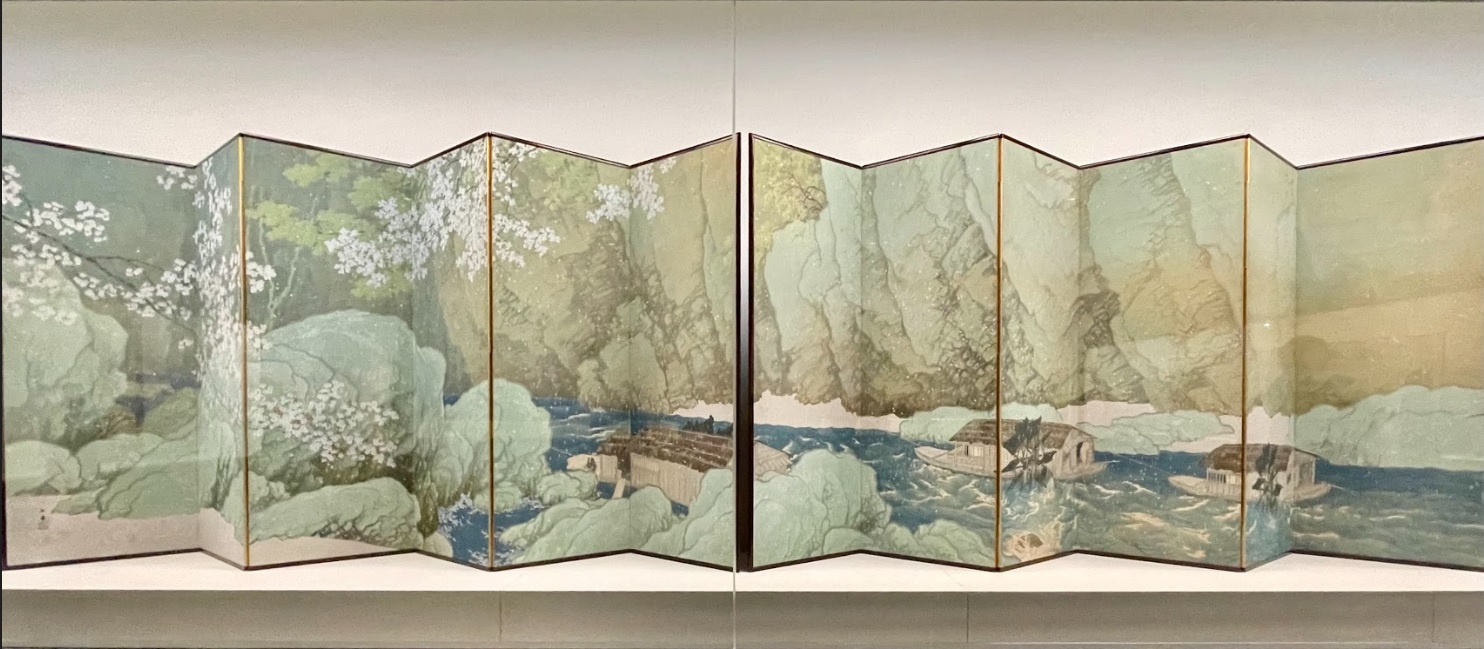 於此同時,近代美術裡的櫻花亦催促著我們賞花的步伐。經過賞花名勝景點千鳥之淵過後,來到鄰近的東京國立近代美術館,日本畫展間裡坐在籐椅及榻榻米上觀賞山水風光。川合玉堂的《晚春》描繪埼玉縣秩父地方的長瀞,融合水墨畫技巧與透視手法,使畫面看起來平實溫和。畫面中下方兩位漁夫,在強調出自然的雄偉外,綠色的山景對比櫻吹雪的輕盈與浮動,增添世間變與不變的情懷。川合玉堂曾在京都與東京習畫,1915年擔任過東京美術學校(現東京藝術大學)的教師,1940年獲頒文化勳章。雖然當時日本畫受夏目漱石為首的文學界影響,流行把自我性格與生命經驗入畫,但川合玉堂仍遵循還原自然風景的傳統,使他的作品能超越時代,讓人產生共鳴。