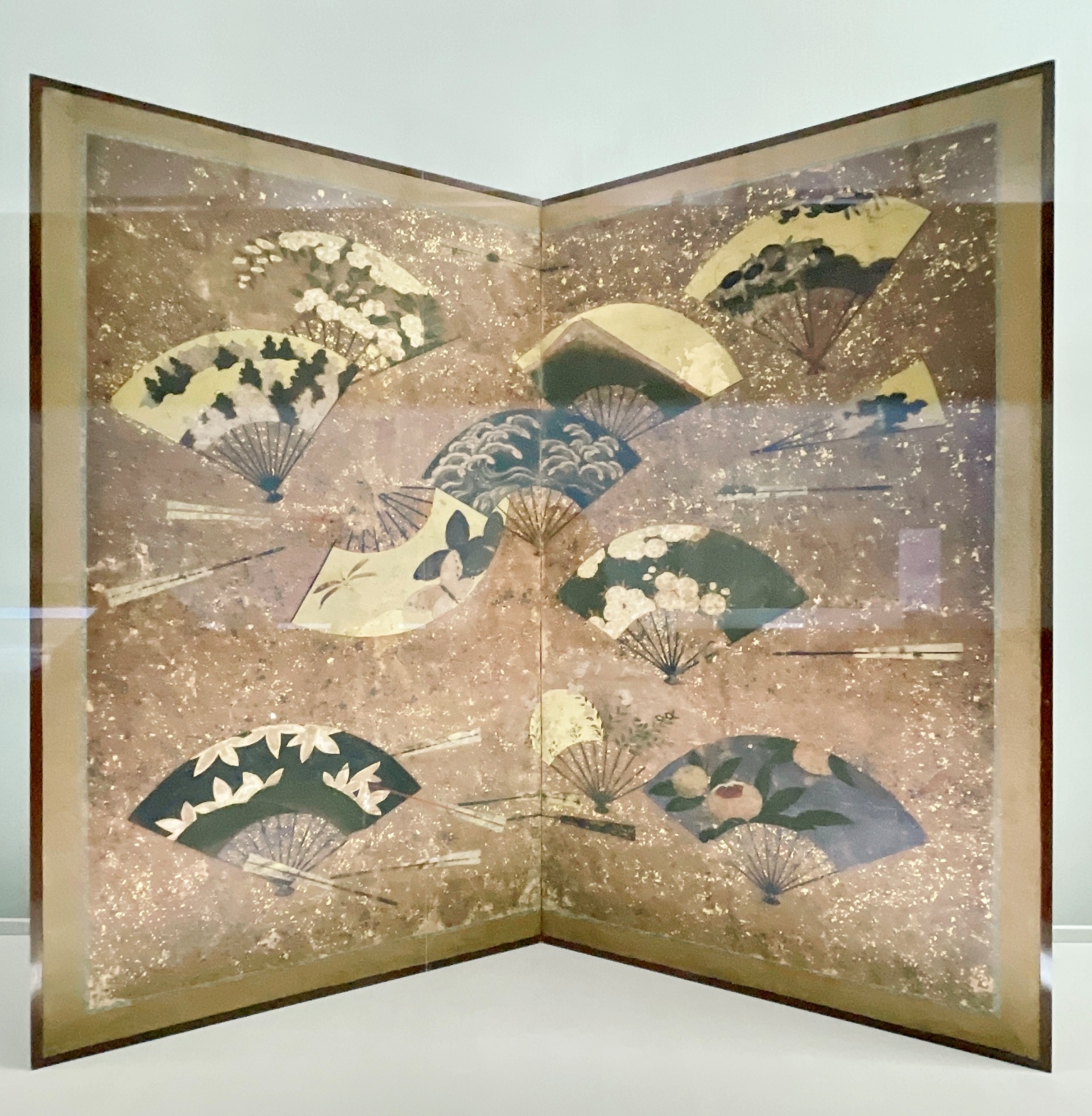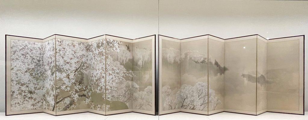 看過近代以來畫家筆下的櫻花後,再看東京國立博物館裡展示的作品,或許會更能感受到不同時代的表現特色。如17世紀傳為著名畫師俵屋宗達的《扇面散圖屏風》,當中所描繪的櫻花就極為內斂。畫面裡的櫻花與牽牛花由胡粉塗成,與其他扇面中花卉圖樣的表現,直至今日仍是日本設計師的重要參考。