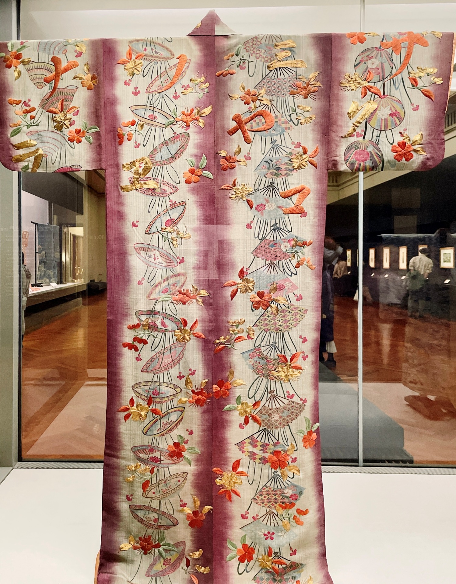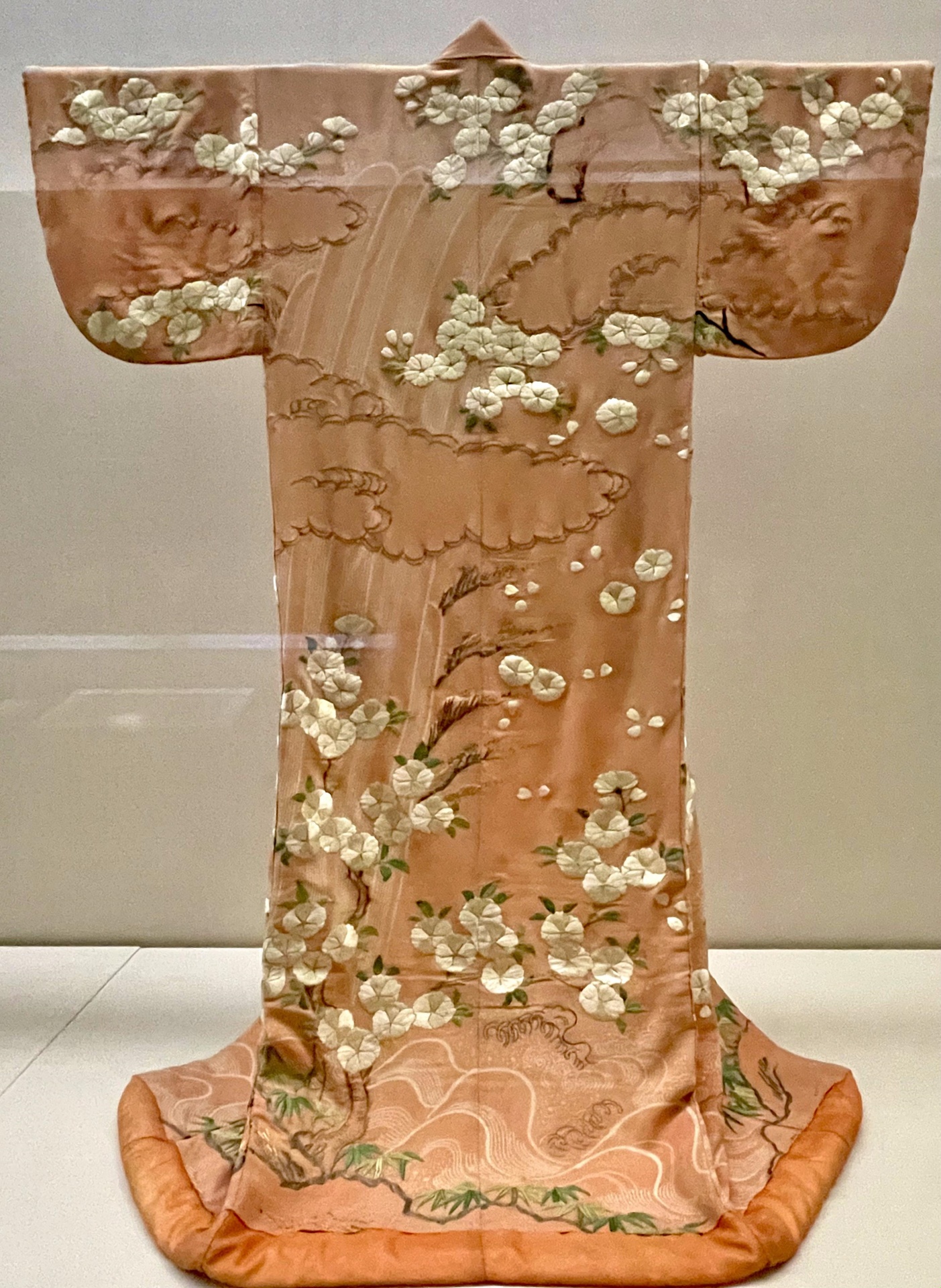 櫻花的意象除了在畫作與屏風外,也被運用在服裝上。18世紀時,日本未婚女子所穿的和服「振袖」婚後會修改成「小袖」或者「打掛」。和服的圖案以浮雲與瀑布為背景,用絹絲繡成的櫻花傲然聳立,被稱為「立木配雲」,象徵著繁榮與純淨,在公卿貴族裡非常受歡迎。另外也有以金絲、絹絲繡出散落櫻花瓣,增添畫面活潑感的。另一件和服中所繡出的零散片假名,組合起來為平安時代中期歌人伊勢大輔作的和歌,古時候的人利用這種表現技巧,來達到傳唱普及的效果。