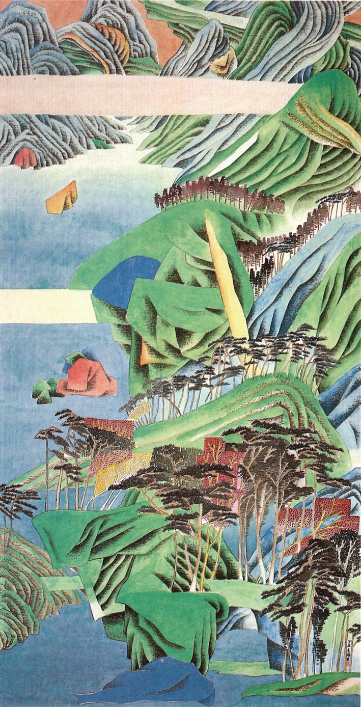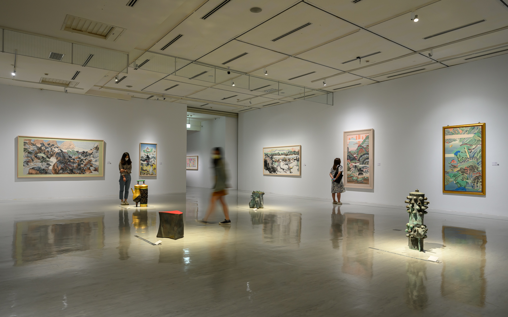 距離2012年袁旃在高雄市立美術館的大型個展已有十年之遙,這次袁旃老師接受國立臺灣美術館的邀請合作這一次的個展,同時間美術館也接受由凱薩琳.大衛策劃、一起工作的期待,於是才能夠繼2020年於龐畢度的精選個展合作後,於今年繼續推進兩位女士的合作完成「賦:袁旃個展」。凱薩琳以袁旃將近60年的生命跨度來鋪陳整個展覽的敘事,以兩件師大學生時期的作品《五牛圖習作稿》(1958)和《野柳晚煙》(1962)開啟展覽,所在的第一展間就以「若危若安」、「若往若還」的狀態來呈現藝術家與傳統水墨構圖形制之間的邊界狀態。藝術家不帶對立與批評的「出走」,正能透露出藝術家與傳統形制之間的恆定態度:回歸自身的不斷試變。從《山河異色》與《家住清溪白石灣》就分別可以見到設色與空間構圖上的不同試驗,前者是在山形空間連通的設計上重置傳統設色,而後者則偏向以飽和設色架構圖面,山水構成元素則因為「消除景深」而形成鄰接關係,逐漸突顯出以顏色或型態的形制自身作為表現重點,垂直關係取消了前後景距離,代之以拼接而形成的張力,而水平關係以橫向動力來經營。此外,在每一個展間都會以視覺上的對仗提點出這一展間的美學主題,凱薩琳就在這裡置放《仙境春長II》(2003)和《神完氣足》(1997)強調出傳統山水形制對於袁旃在直至2000年左右的創作而言,是非常關鍵的基礎同時也從這兩幅時間上稍晚的作品指出古法用筆、絹本重彩的設色是出走後以「異山水」為名的重要發展。而這兩種特質又充分呼應為何策展人展出四件以畫中局部元素翻塑的銅器雕塑,似乎也說明了器物對於藝術家決定型態與顏色的發展取向有著密不可分的關係。