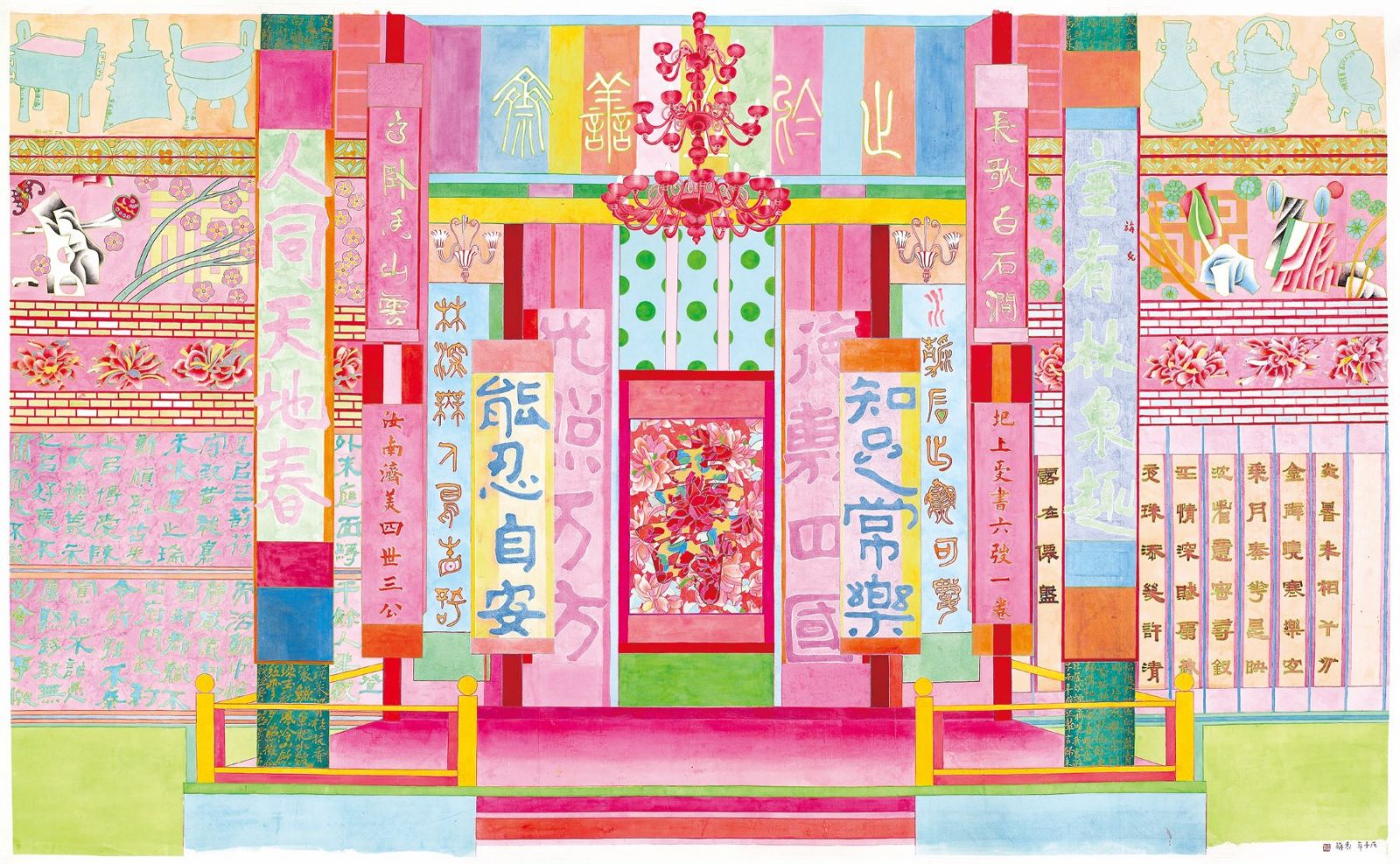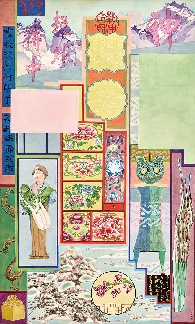 此外,「內務化」也會在表現時將納入的元素轉化為布署時的「物」。因此,「內務化」或說俗稱的「家務」,都內含著「媒介」的操作。古畫中被擷取的圖像成為畫作中的媒介物,器物成為藝術家延展記憶的媒介物,器物是器物上紋路的媒介物,日常生活中的圖像與敘事也成為畫作構成的媒介物。所謂的「媒介物」,也就是被置入符號與物性不分的流變場域中的元素。而符號與經典元素之間的微妙平衡,經典元素在袁旃的內務化(及物的直接性)中「流變為物」(物變的媒介性)時,這些符號與元素會同時進入一種平等關係,並讓這「平等」在浪漫的「賦」中讓所有組成於世界中運行,並參與世界形貌的生成,一如莊子《齊物論》的世界,如展覽說明為袁老師的作品做出「兼具歷史文化的修辭隱喻和生活物景的即興情感」的註腳。「內務化」的齊物觀跨越了傳統「修身、齊家、治國、平天下」的儒家次序,是一種回返個體與日常的自由之術。如同策展人凱薩琳.大衛(Catherine David)對藝術家生平所細緻描寫出的生命景象,「文物」成為連結個人生命與文化歷史和大敘事之間的環節,它們在繪畫中的重新塑形,一方面確實暗示著藝術家生命無法擺脫從中國到臺灣、歷經戰亂、冷戰、文化認同的社會處境,以及跨文化、跨形式的知性世界。另一方面又讓所有元素在個人性情的鋪陳與開展下,交互變幻、連結、共存、融合。既是個人突穿各種政治性幻見框架、展現寬宏視野的主體力道,也是以客觀之物、環境、敘事關係重塑自身態度的實驗之術,都在在指向對自由的堅持與翻新,一如凱薩琳標示出的「狂想曲」。
