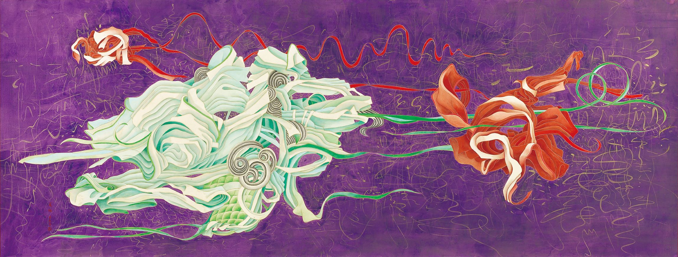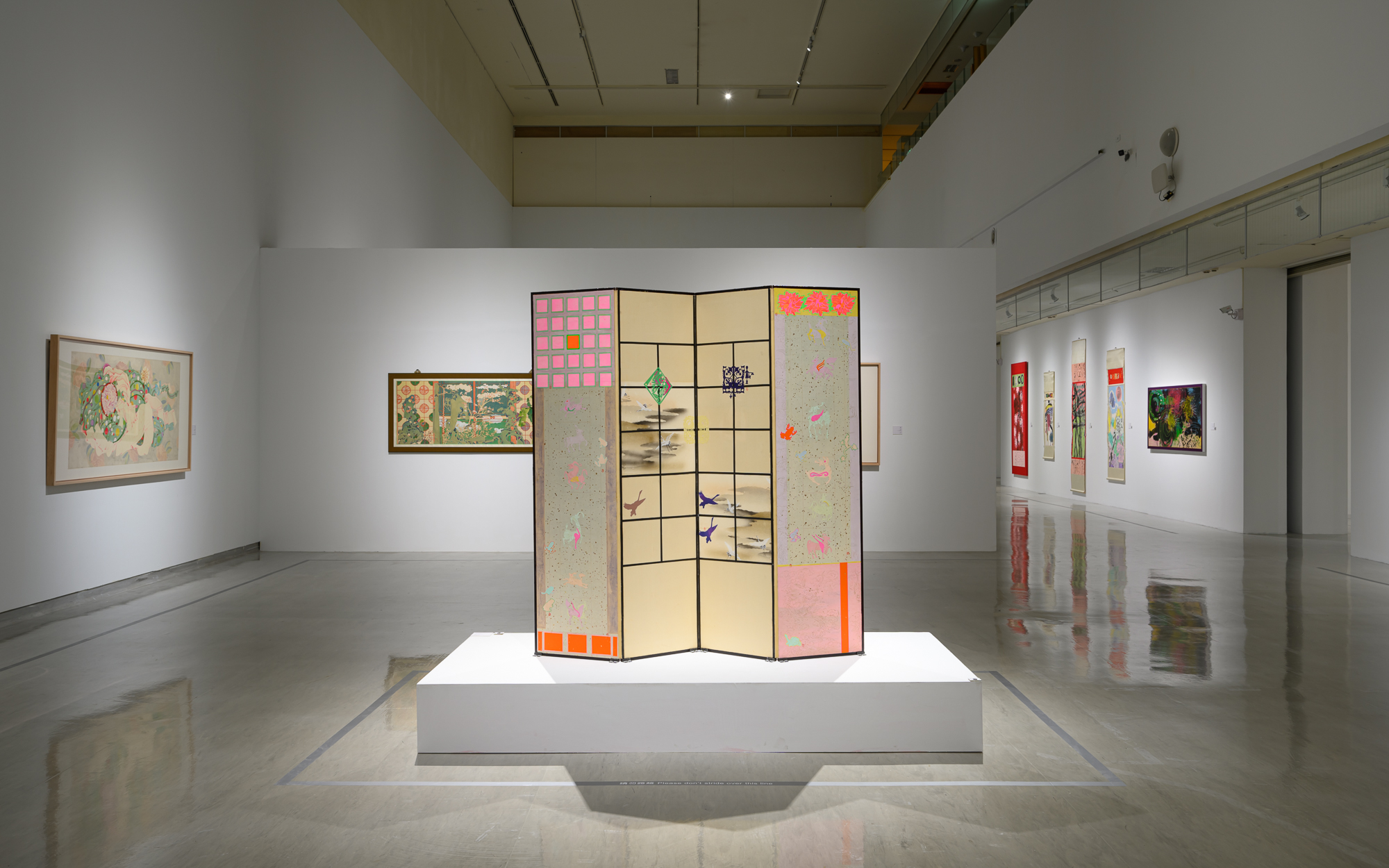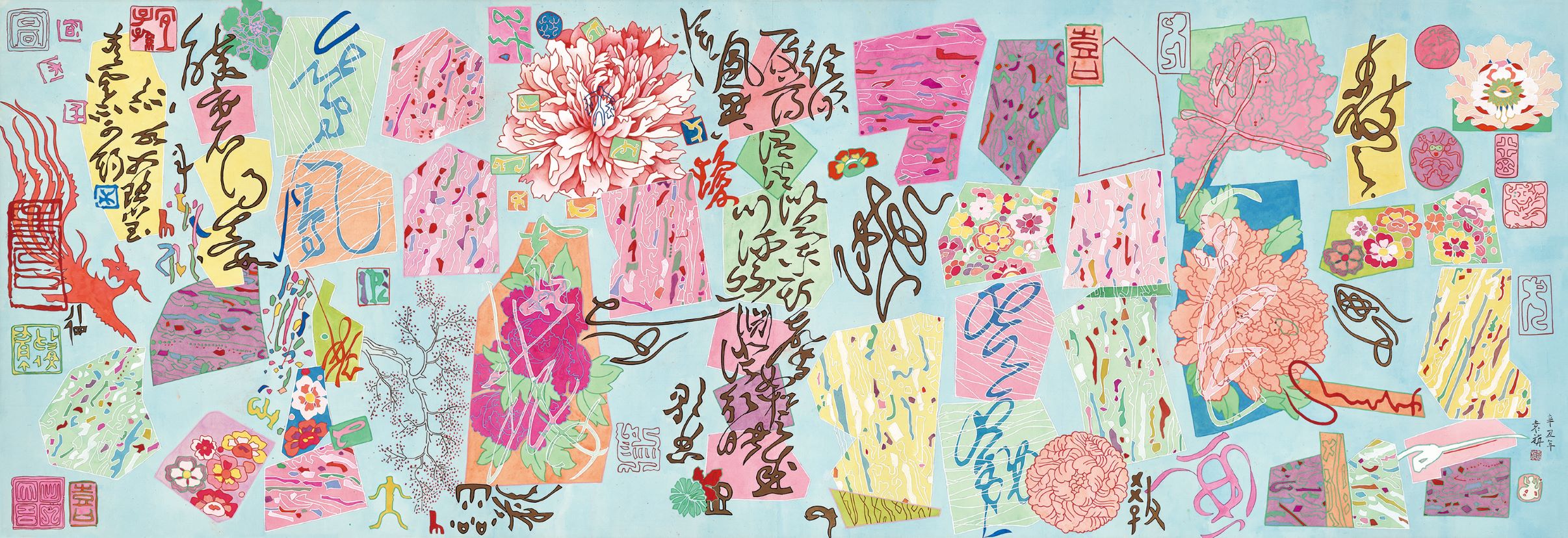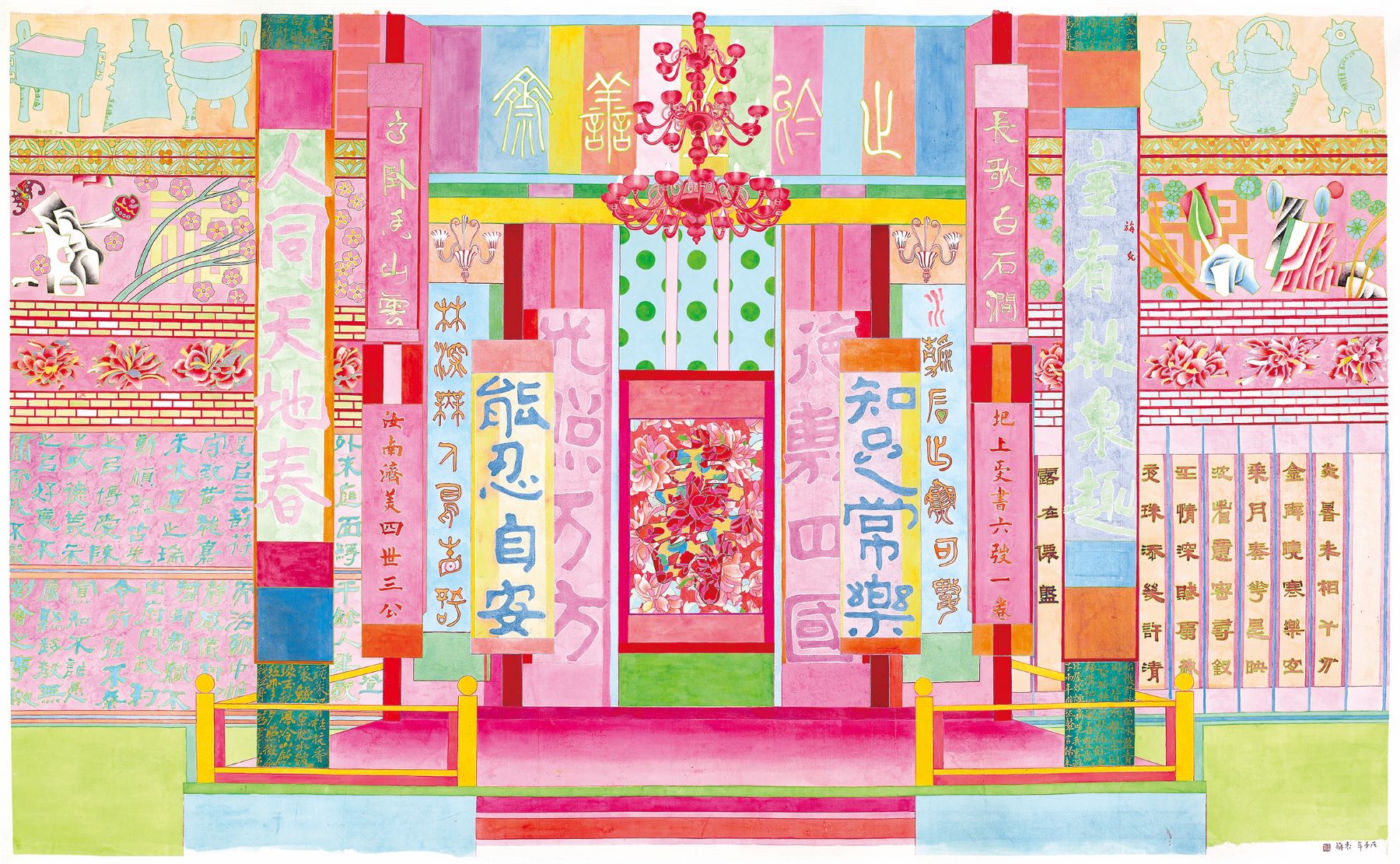 進入隔成三個展場的最後階段,也隨著2012年的大型個展後,藝術家的創作似乎越來越沉潛到文本與生命對話的深度世界和創作實驗之中,第一小展間中以書法和繪畫在入口處即形成對仗,以形象入書,如《珊瑚枝枝》和《手把青秧》(2017),和以形象代書的《三羊開泰》(2014),對應著以字入畫的《聽雲走路的聲音》(2015)、《夏天》(2014)和各種象徵交替拼接的《萬(萬)歲圖》(2014)。其間兩幅《鏡花園─富春山居》和《旺來》(2014)讓文物所記錄的崇高象徵成為物件,而以廊道牆面呈現個人觀想下的趣味與設計,這樣的安排呈現出袁旃從「書畫同源」中所開創的「書畫共生」,讓書寫、圖像與象徵、構圖交互滲透、並置共生。第二個小展間集中在「思緒微光」的呈現,策展人簡潔地選擇了2017年與2018年以「鶴」作為主題的《瑞鶴圖》和《洛神》,兩者典故都涉及到亂世中不受影響、持守純粹初衷的內斂之光,崔瑗的《座右銘》如此,曹植的《洛神賦》更是,如此《藏經洞》(2019)中援引敦煌壁畫上的設色與頭像就更可以說是某種直接譬喻。而這三幅畫作中的形象幾乎皆出自「引用」、並以「圖鑑」式的排列經營畫面,彷彿要讓觀眾從「矩陣」的框架中看到隱藏在邊界與隙縫間的「意趣」和「思緒」,在物的陳列、技法的排比、圖像的並呈等等「內務化」的運作下,看到不斷流動漫漶的自己。如此,展間中唯一新作《鋪殿錦》(2021)在彷若裝飾性的綢緞拼接的構成裡,當我們細究牡丹的筆法就會訝然發現花瓣出現線條交互穿梭、切割的碎形結構,意味著幻化的不再只是型態或主題,而是拓樸線條的遊走(14),搖搖對應著最後展間中的《十洲春盡花凋殘》(2019)與《賦》(2021)。