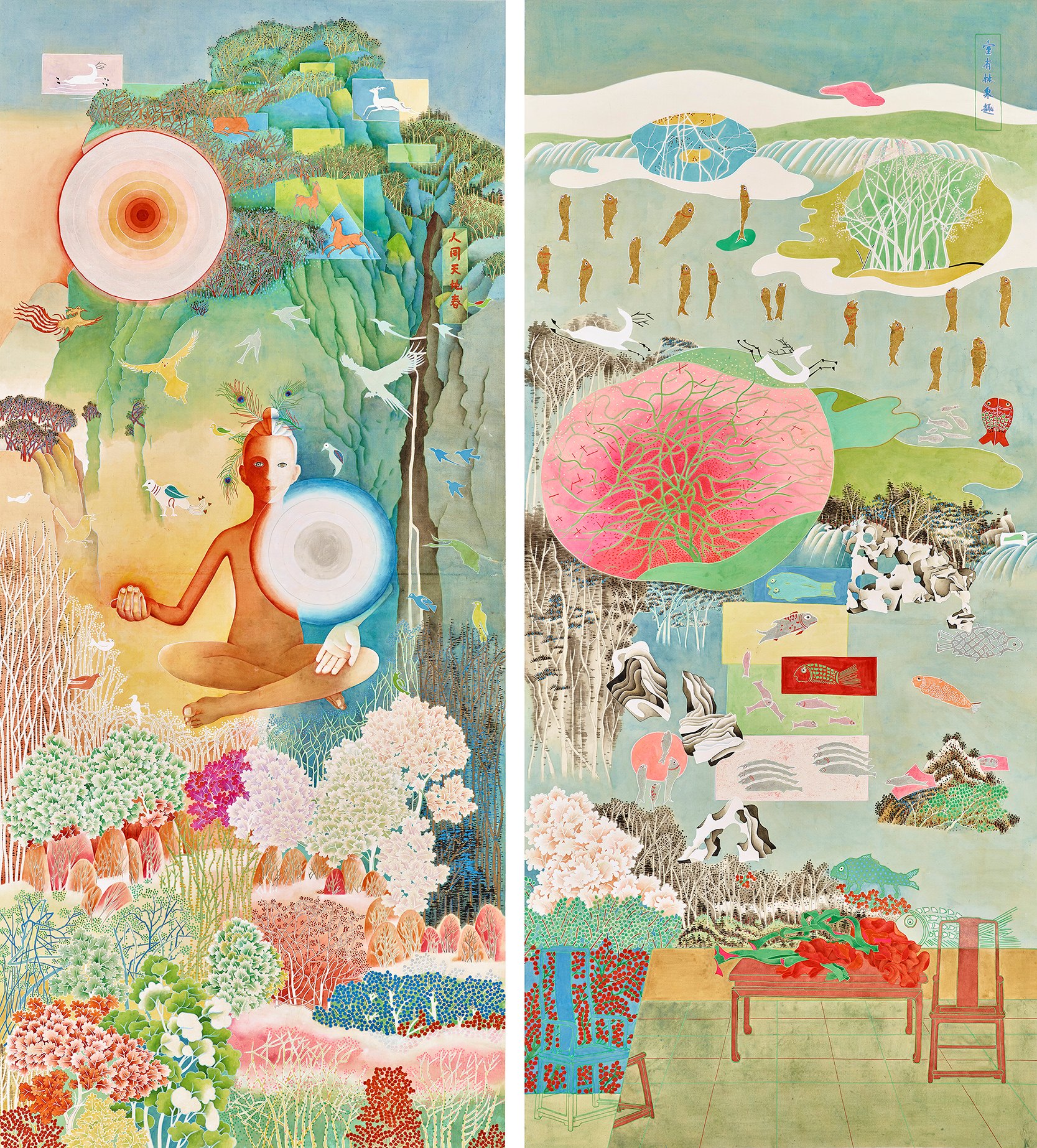 氣韻生動、骨法用筆、應物象形、隨類賦彩、經營位置、傳移模寫,源自南朝謝赫《古畫品錄》,在董其昌的轉譯中,「驅役萬象,鎔冶六法」就在於心、器、象三者融會的「描寫」,而器(筆)的運行是隨著氣象景觀而變,這項運作的核心就在於「觸及」,也就是「賦」(描寫),換言之,「會心」必要觸及生活、居所,必須觸及天象地貌。會心,既是驚異顫動、也是令日常有感。正值成長茁壯的藝術家,置身在文化認同與知識爆炸的交叉黃金點上,在這六法上皆出現了出格的創意與處理方式,徘徊在物與心之間的「骨法」、以挪用的後設手法成就內在與外在之間的「呼應」、以設色方式的實驗進行「跨類」賦色、以心的拓樸展開「非線性」的布署(宇宙論)、以文化宇宙論的創作改寫訊息「轉導」關係,袁旃的「氣韻」就是這般「幻化」所展現的能量。一如佛萊德利希.馮.哈登堡選用的筆名「諾瓦利斯」的意涵:畫出新地。如果說袁旃的創作回到「室有林泉趣」的「居」的自在,那麼「人同天地春」便是從日常幻化出宇宙論的「活」。