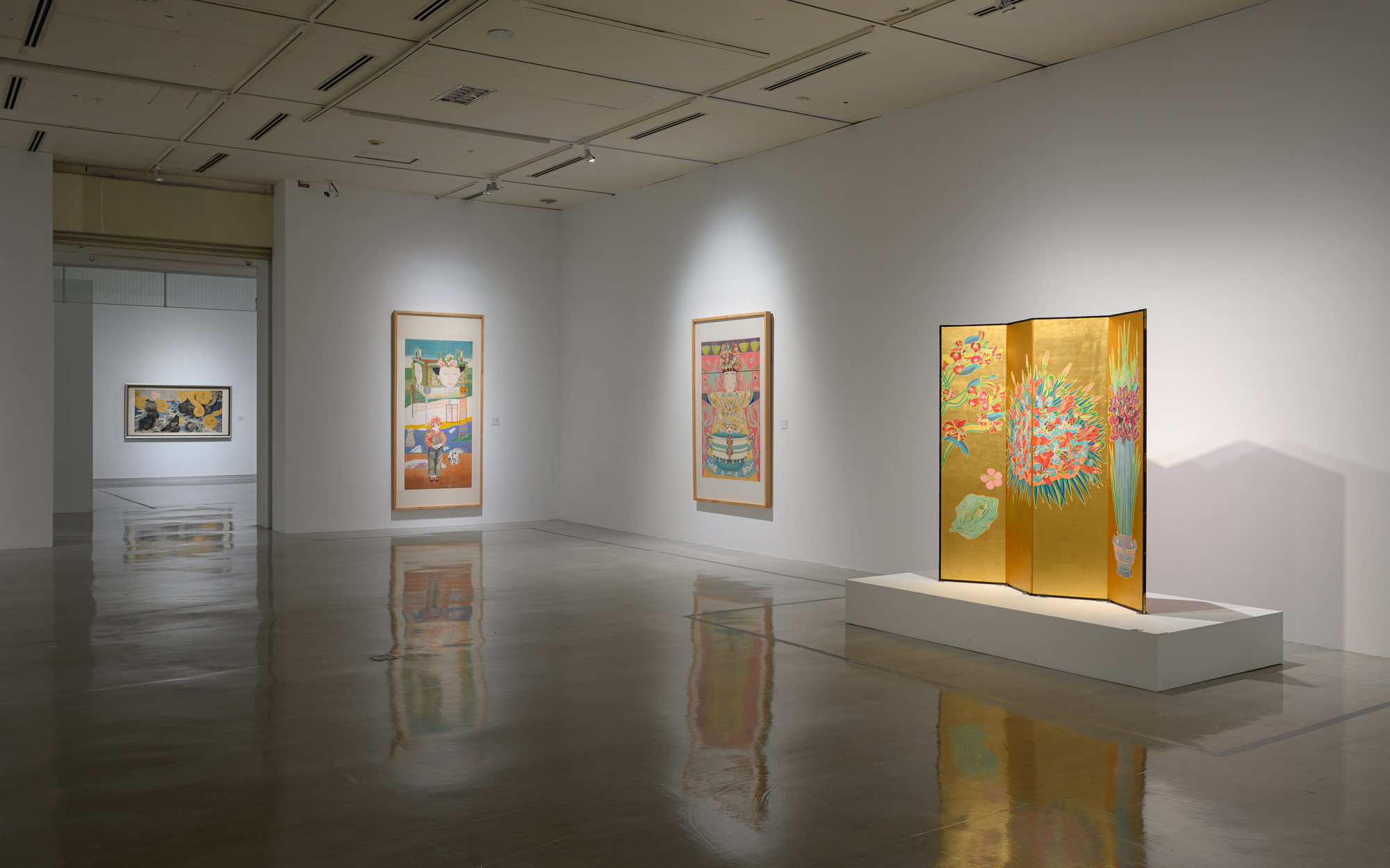接著進入到這展覽中最大的展廳,想當然爾此處會錨定出這個大型回顧展的根本主題,從入口處就可以見到出口兩側對仗的兩件作品是同樣2008年完成的《文化廳》與《工作室》,色系布署相近但一繁一簡,一是一種再現現場深意的寫實描繪,另一是以器物譬喻的象徵描繪,設色完全地將具有道統意味與論理意涵的要素「內務化」,意即讓自身生命以一種極具「出格」的特質,滲透覆滿各種框架,「涵納」力量成為袁旃處理生命脈絡與關係的表現性所在。而環繞展廳中的其他作品與上述出口處兩件帶有「道統」(或父權)框架的作品之間,則形成相當適切的對應,除了以歌舞場景與出口遙遙相對的《遊園驚夢》(2013)外,其他就是完成於2008-2011年之間以自身和家族「女性」角色為主題的畫作,從《我》、《二女兒》與《我七十歲了》中的紅髮女人,《鑑》、《二女兒》與《玄》,包含《我七十歲了》以大量的器物圖樣架構人物樣貌、或散佈在形象描繪中,無論是否巧合,彷彿在此時期匯聚出一種「女系」的關懷。在紅色粉螢光的帶動中,甜美中含帶熱情(一如《遊園驚夢》),也同時展現顏色的涵納之力,充分彰顯出袁旃具有超越性、不斷穿透框架、持續幻化的藝術能量,而屏風《歲歲富貴》與《反撲》則彷彿在此處暗含一個微妙的張力。