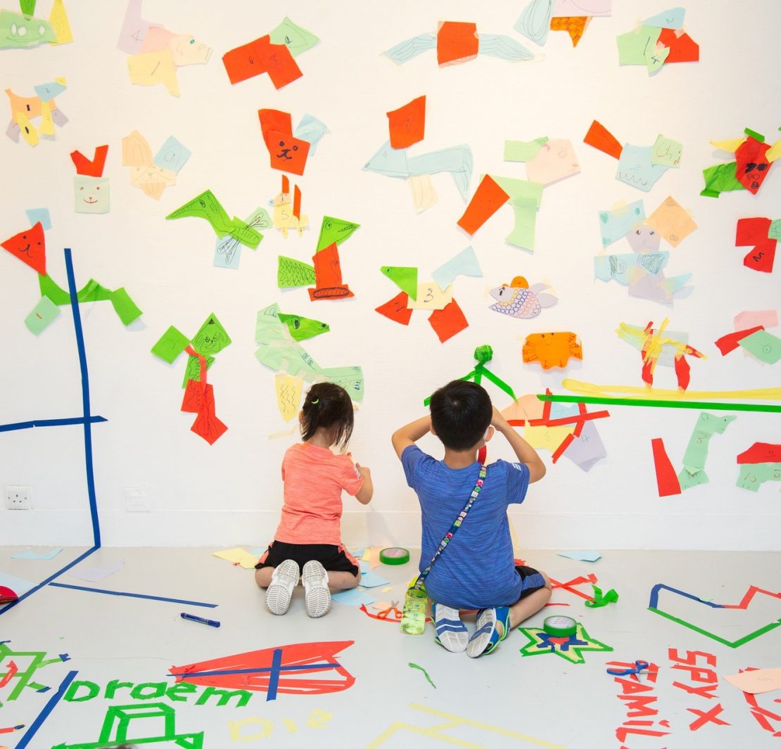 開啟創意的鑰匙並不神奇,也不需要甚麼高科技。放在桌面的材料包,不是文具,就是家品。不名貴,也不稀罕。關鍵不在於面前的物件,而是背後的信任和尊重——我給你畫筆,我同時也信任,你會畫到預定的地圖,而不是展場裡的白牆;你獲得畫筆,你也懂得尊重,我會畫在彼此約定的地方,而不會為難對方。簡單物件的背後,不簡單的是人與人相處的默契練習。畫筆有畫到浴簾外的時候,主辦單位還是要出錢出力去還原。展覽最後一天,白雙全更現場邀請孩子們,即興來一場「還完膠紙工作坊」,一起拉出地上的膠帶,滾出七彩紙球的雕塑。大家一邊玩一邊清理,同時學習承擔後果。練習不是沒有成本,但有成本不代表就要反過來否定練習的價值。