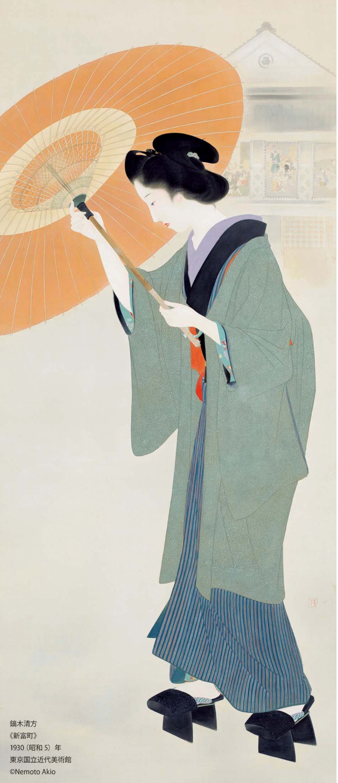 在《築地明石町》發表三年後,鏑木清方同樣以人生裡重要的生活地區命名,畫了同系列作品《新富町》與《濱町河岸》。《新富町》描繪一位撐著傘急忙前往劇場的藝者。藝者身穿黑縞色的和服與單色羽織,內襯卻有明豔的花樣。女藝者前往表演的是1878年建立的「新富座」,正是鏑木那一年。劇場使用瓦斯照明燈與手繪看板,是當時極度摩登的象徵,可惜在關東大地震時震毀。凝視著鏑木美人的同時,也不禁讓人感受到時代的變遷。