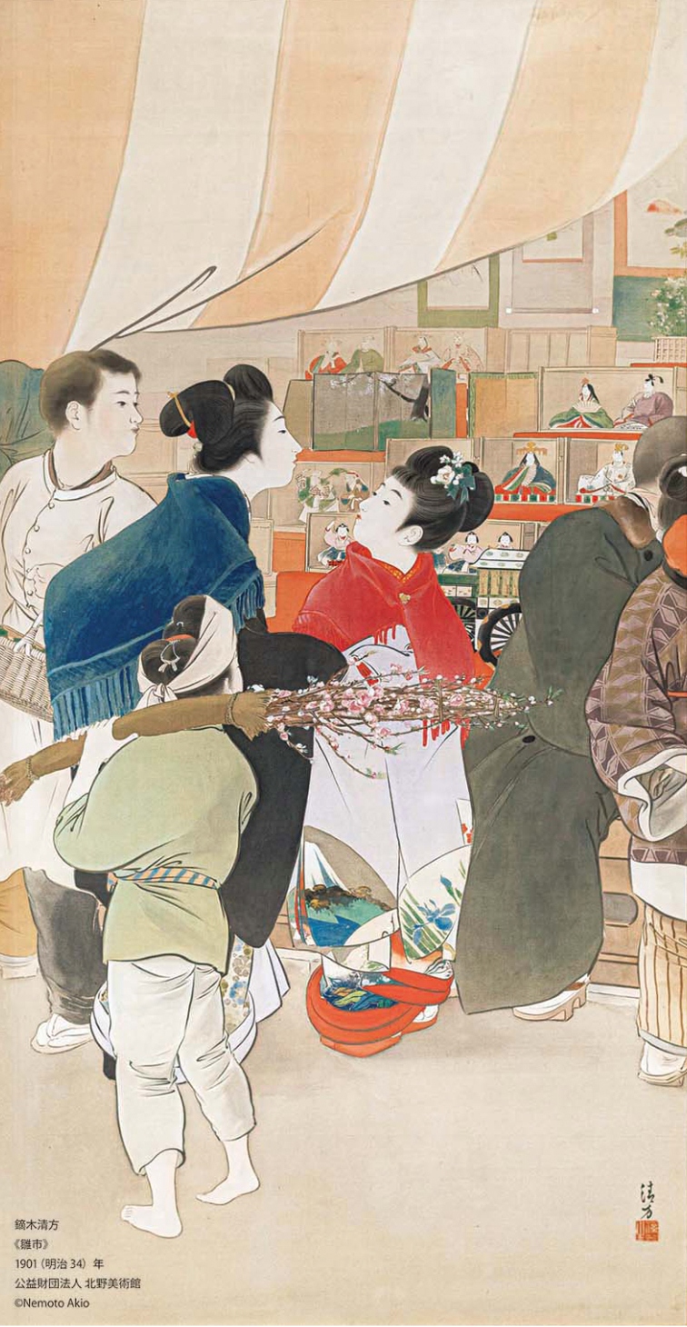 鏑木清方自小熱愛閱讀報章雜誌,觀看演劇與相聲等,父親是《東京日日新聞》的創刊記者,從小勵志成為插畫家,替報紙連載小說中繪製插圖。鏑木在21歲時畫的《雛市》,描寫女兒節前,市場上一位披紅絨披肩,穿著華麗的女孩正盯著母親,央求購買女兒節人偶。然而前方另一位扛著桃花、沒有穿鞋的女孩,也不約而同地注目人偶。同樣渴求的心情,兩者境遇卻天差地遠,是鏑木清方早期經常刻畫的日常題材,也呼應初立家業卻懷才不遇的心理寫照。
