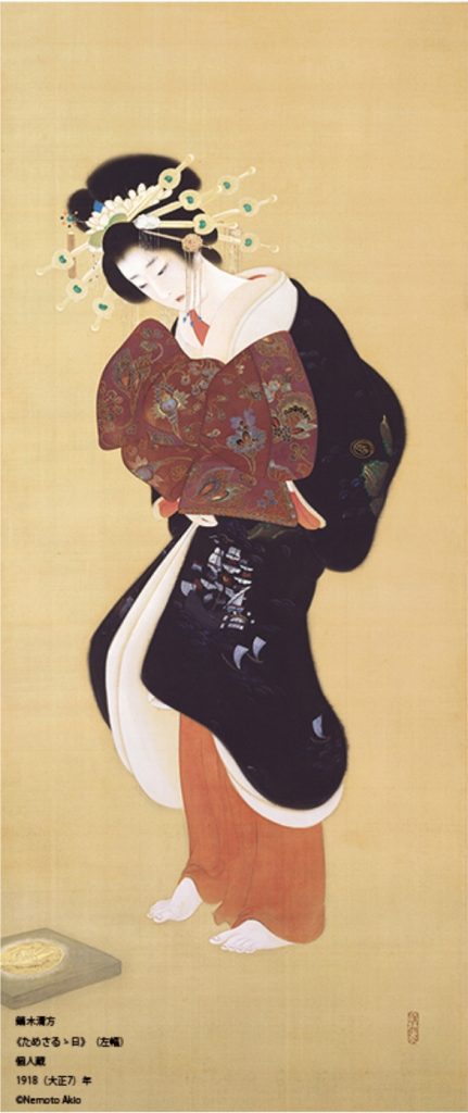 1912年,鏑木清方與妻子及兩個女兒清子、泰子,轉住東京本鄉龍岡町,同年七月明治天皇逝世,進入大正時代。此時的他減少插畫工作,潛心創作。因大量臨摹浮世繪的關係,不難發現這時鏑木清方的作品少了初期的空間感,人物的平面性與裝飾性相較明顯,摸索出個人特色,也使他屢次在帝國美術展中入選受賞,穩坐日本畫畫壇。然而在對官方展覽的不信任下,與志同道合的友人結成金鈴社,擁有自由創作的最大空間。