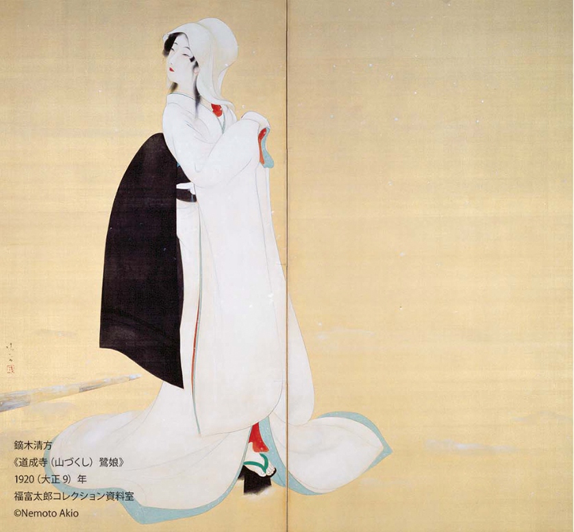 《道成寺鷺娘》是從「京鹿子娘道成寺」與「鷺娘」兩曲歌舞伎舞踊為靈感繪製而成的作品。右幅花色和服女子手持羯鼓、蓄勢起舞,道出少女「白拍子花子」追求愛情的千愁萬緒,左幅身穿「白無垢」的女性,的則是由白鷺鷥幻化成的鷺娘,在愛情中翩翩起舞,最終在漫天雪地下現回原形而死去。描繪出女性愛情中的模樣,一邊激動、一邊靜謐。